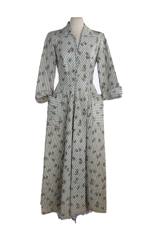 1940's White Floral Print Striped Long Dress