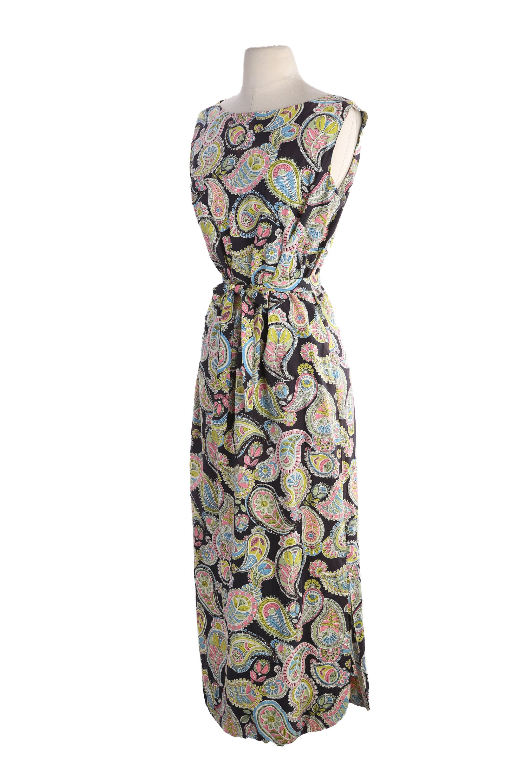 1950s Women Black Casual Dress with Pailey Print Sleeveless Waist Belt
