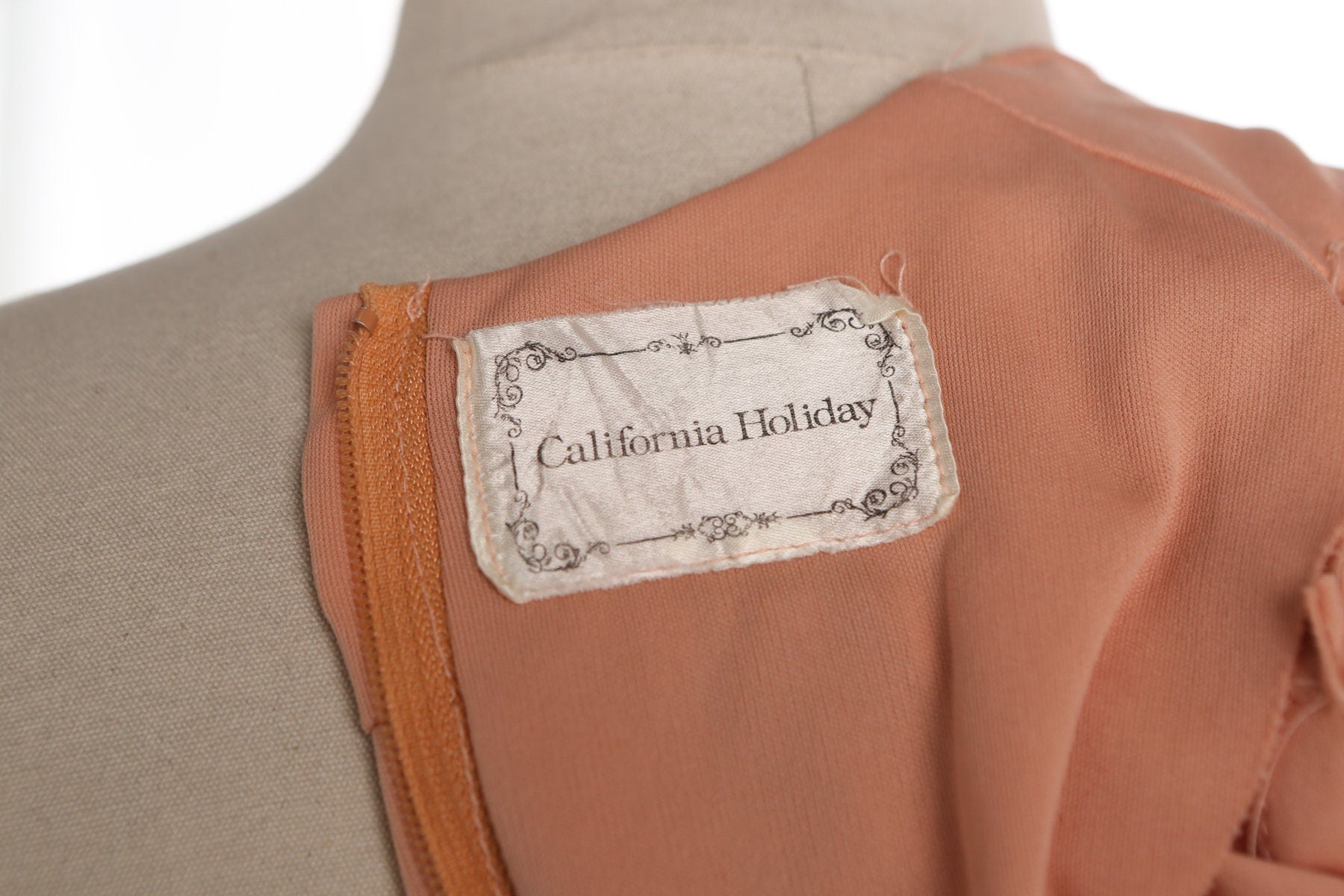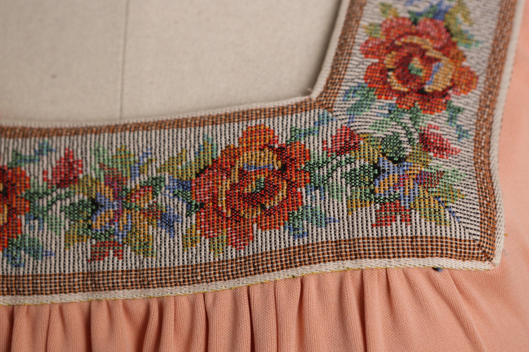 1970s Women Long Pink Boho Dress with Floral Patch Collar Detail