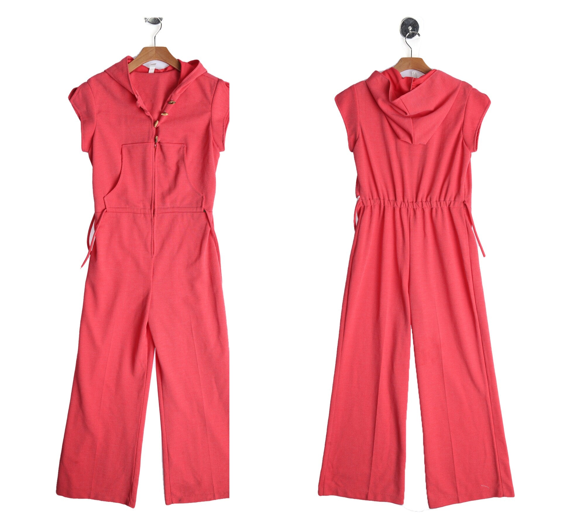 1970s Women Pink Poly Jumpsuit with Hood and Waist Adjusting Belt