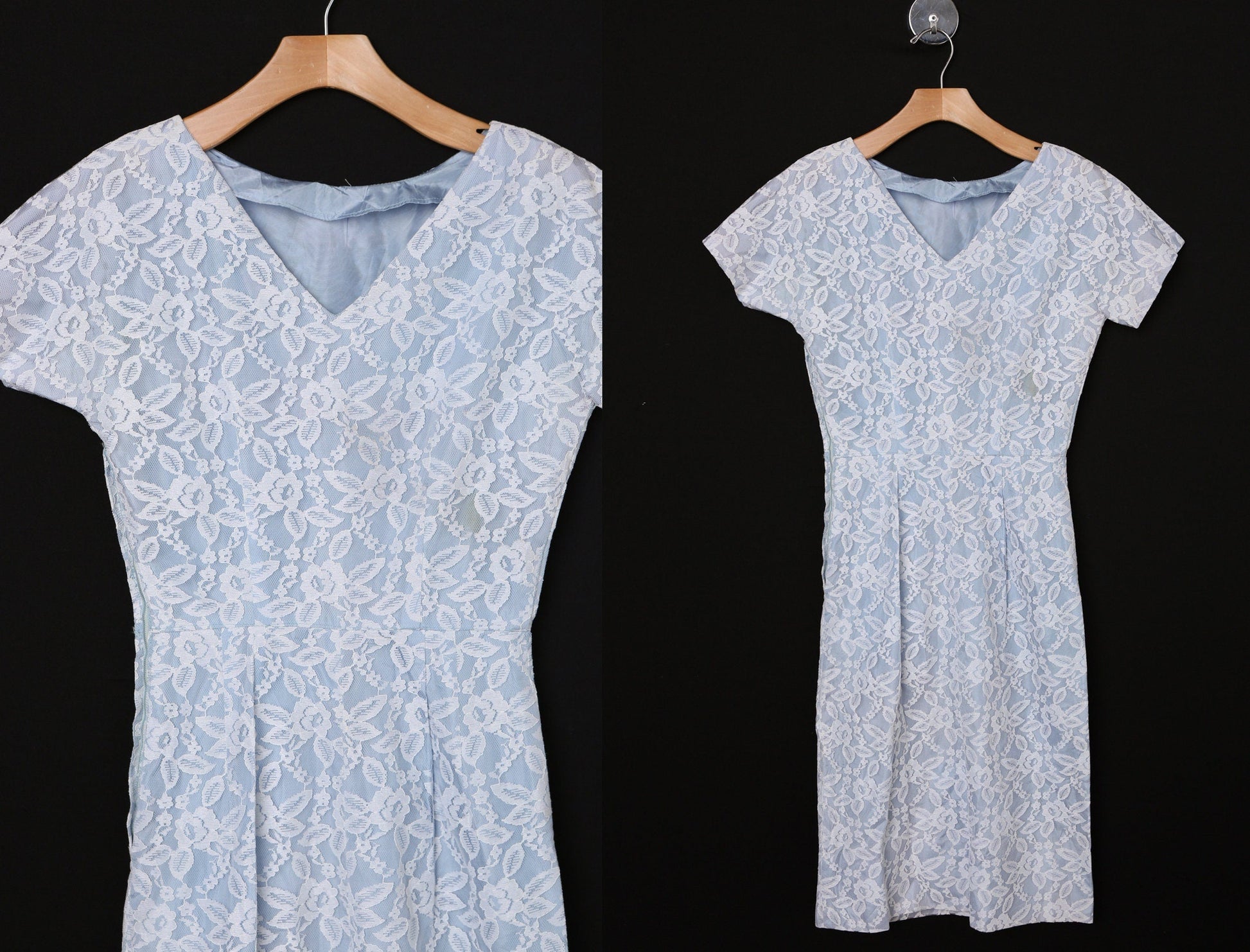 Vintage 1950s Dress / Lace Floral Pattern / Short Sleeve / V neck