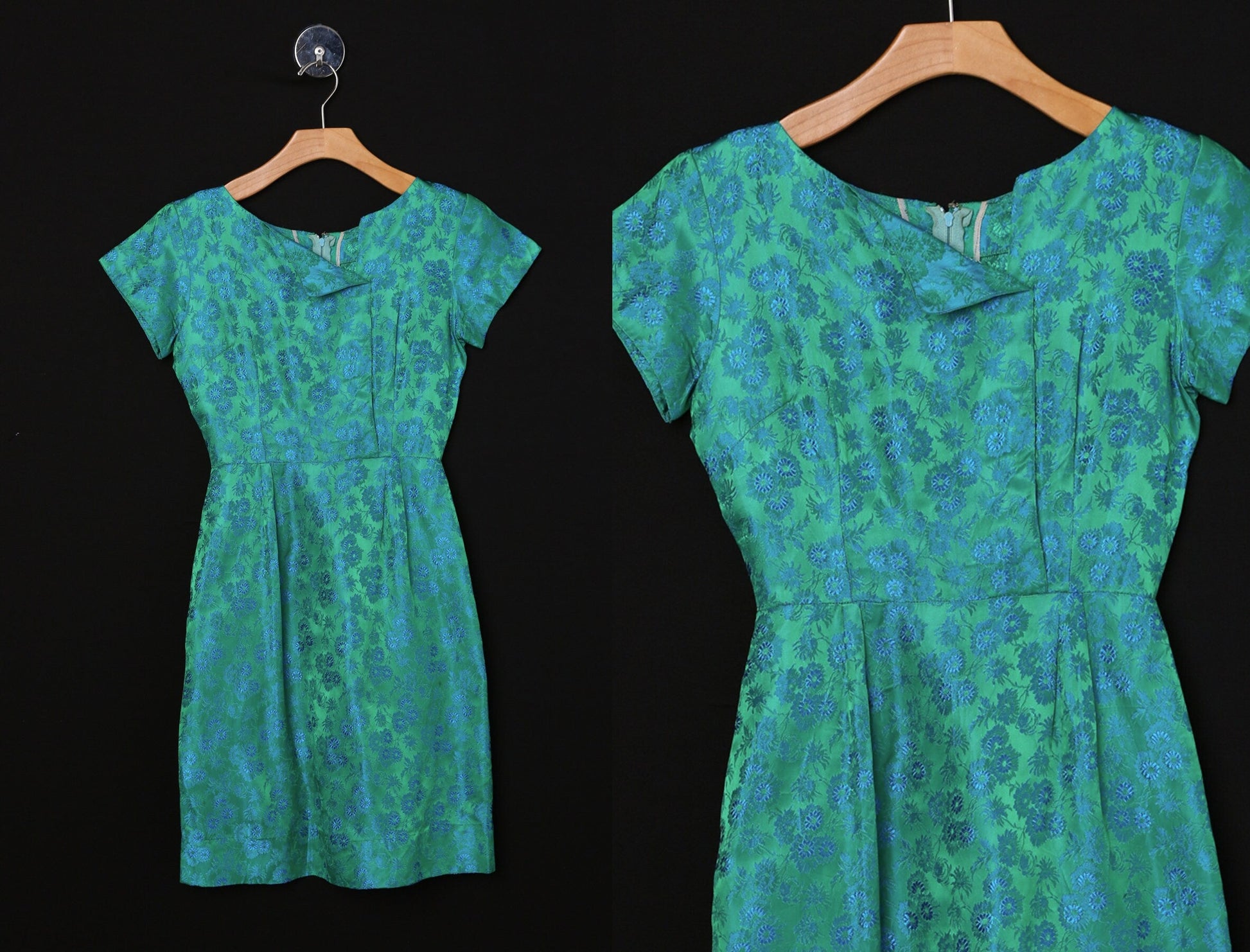 Vintage 1950s Dress / Green Floral Brocade Fabric