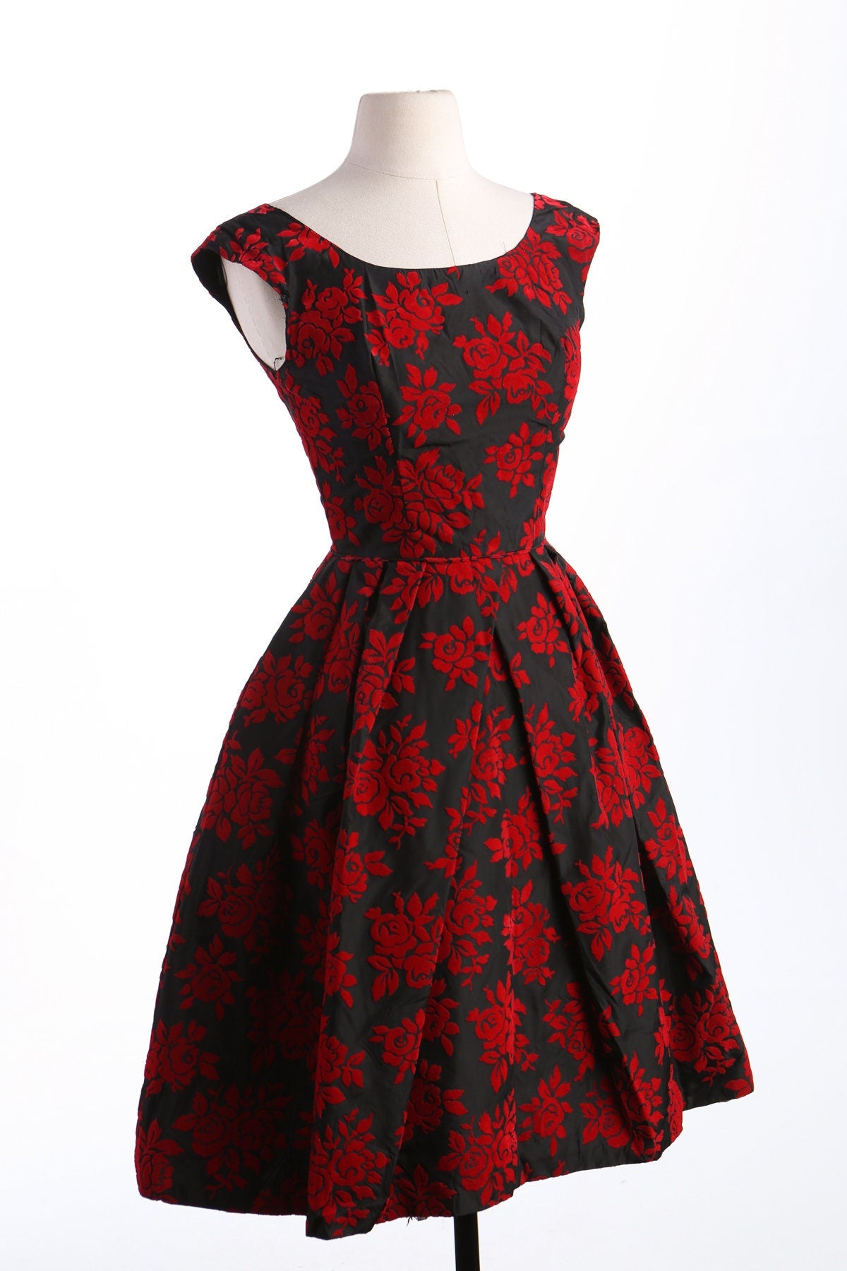 50's Women Black And Red Roses Print Short Sleeveless Evening Dress