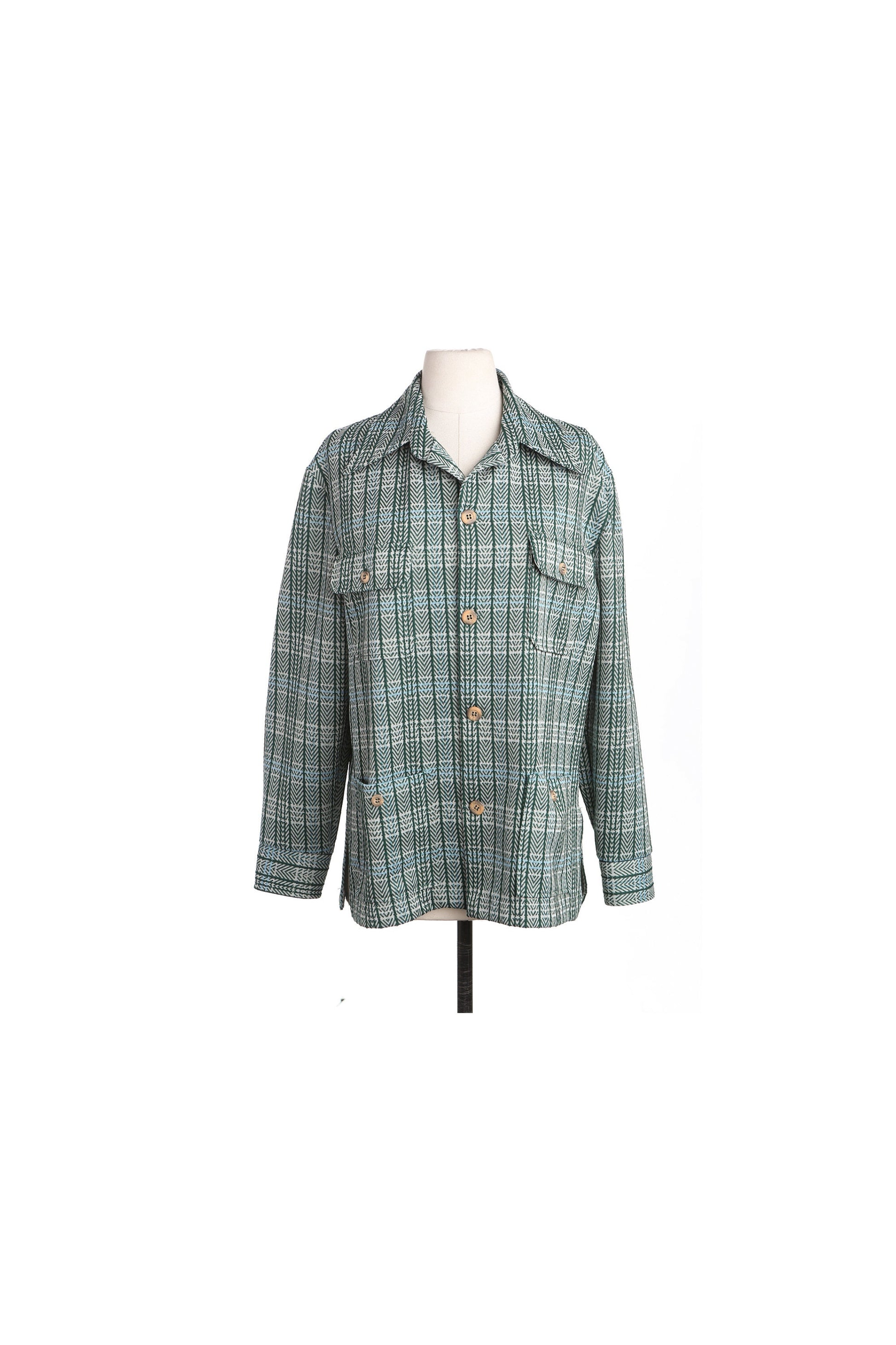 70's Men Green Plaid Button Shirt - Four Pockets