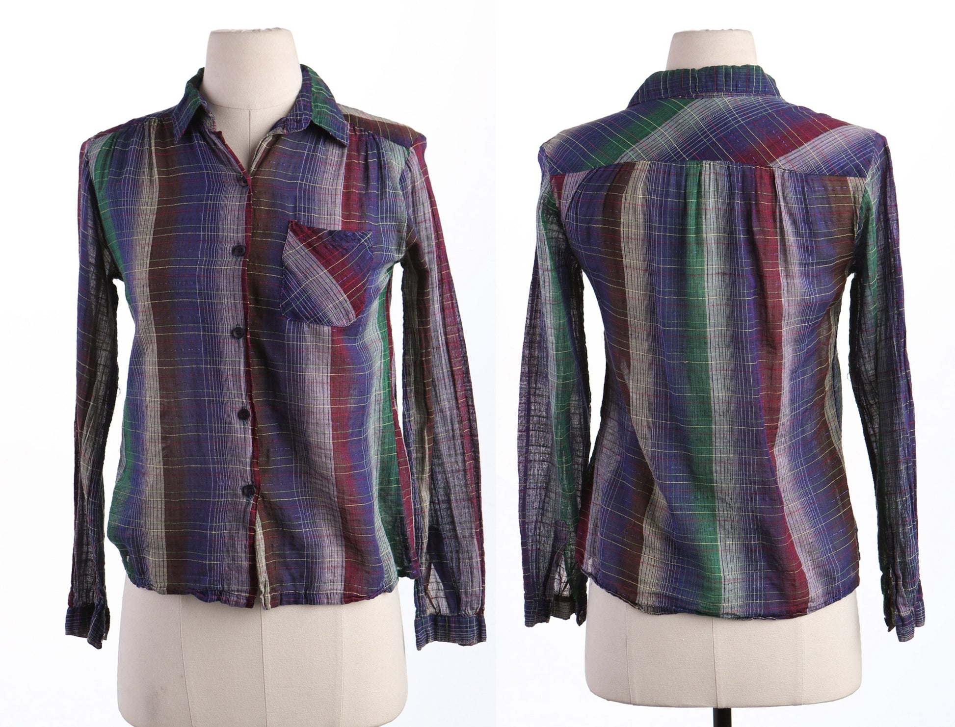 70's Women Plaid Cotton Button Up Blouse