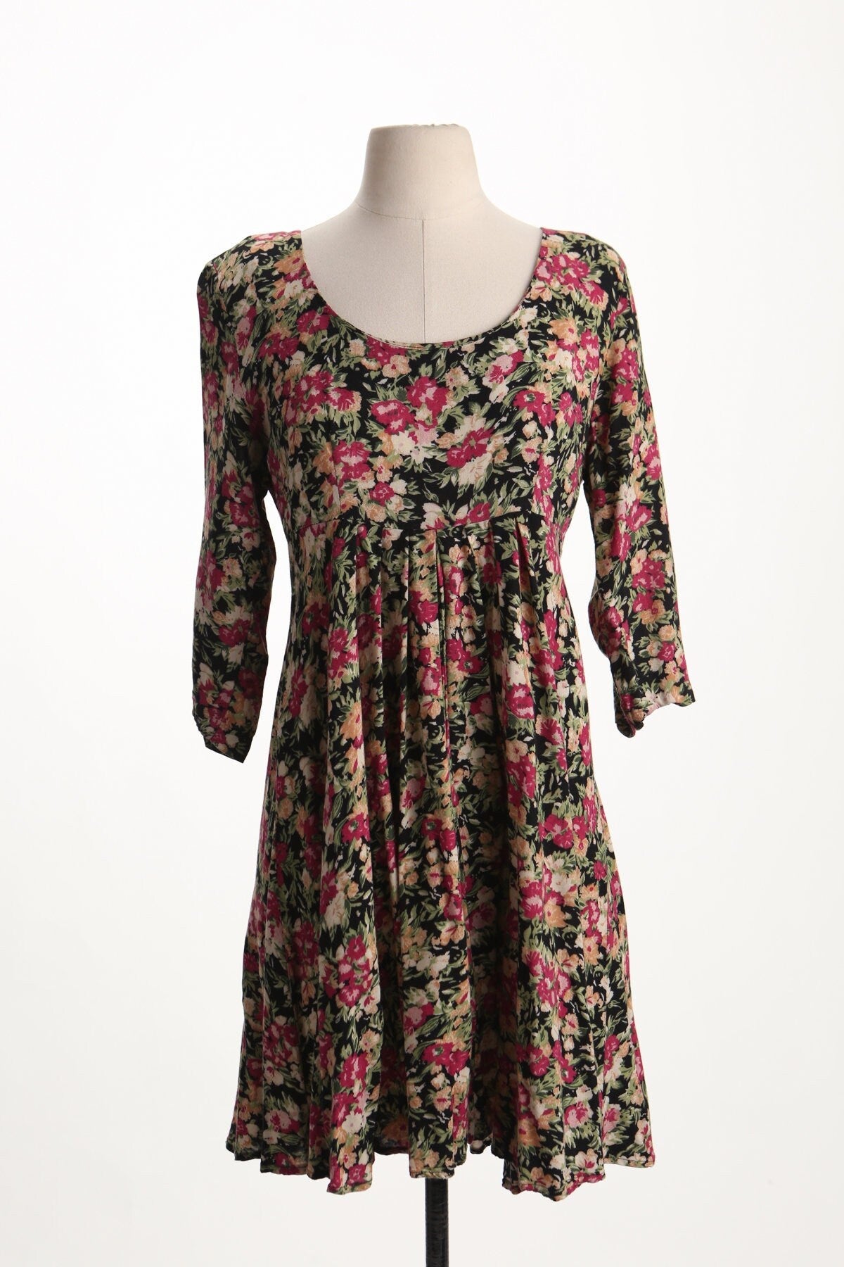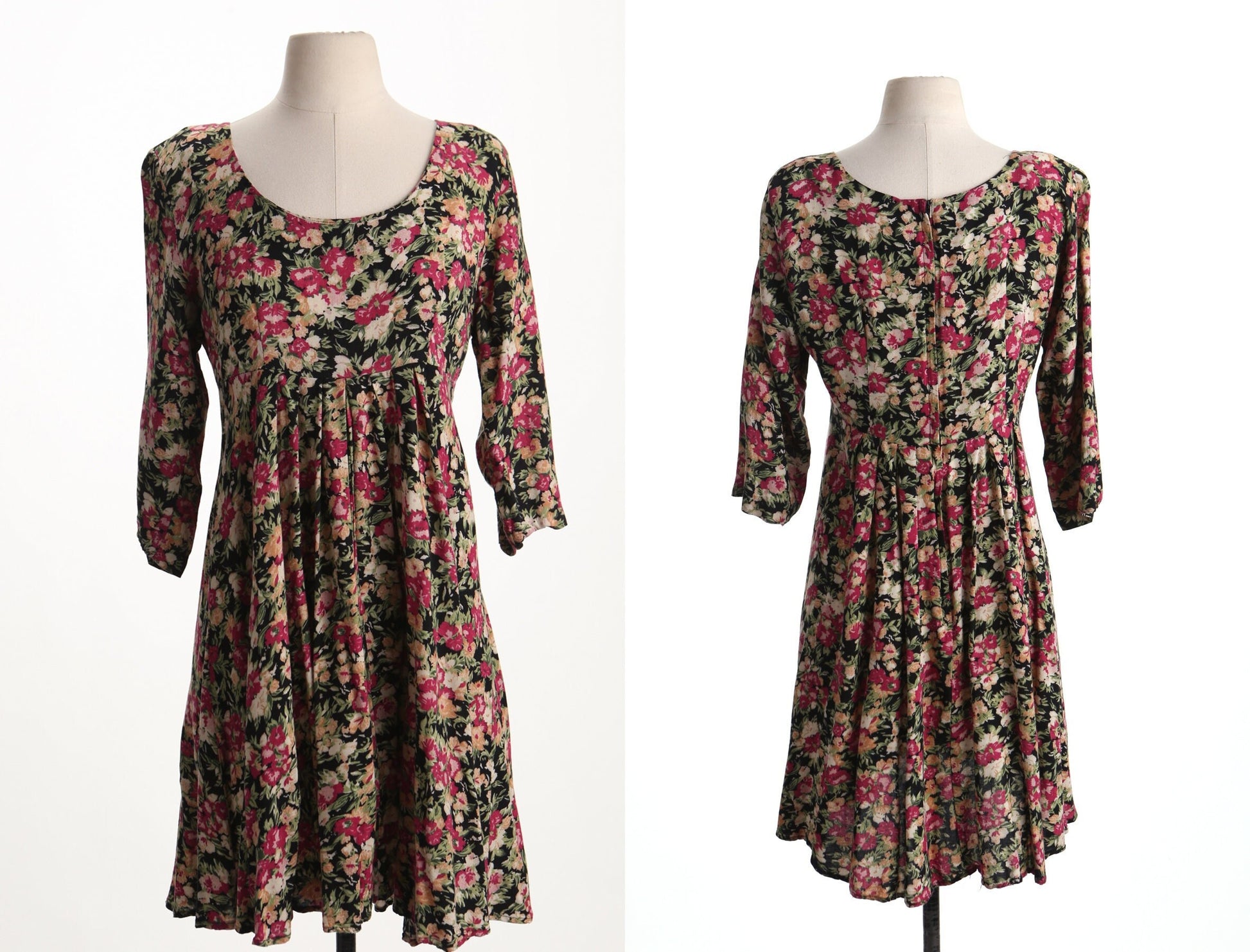 90's dress black floral summer women vintage print yellow pink flowers back zipper