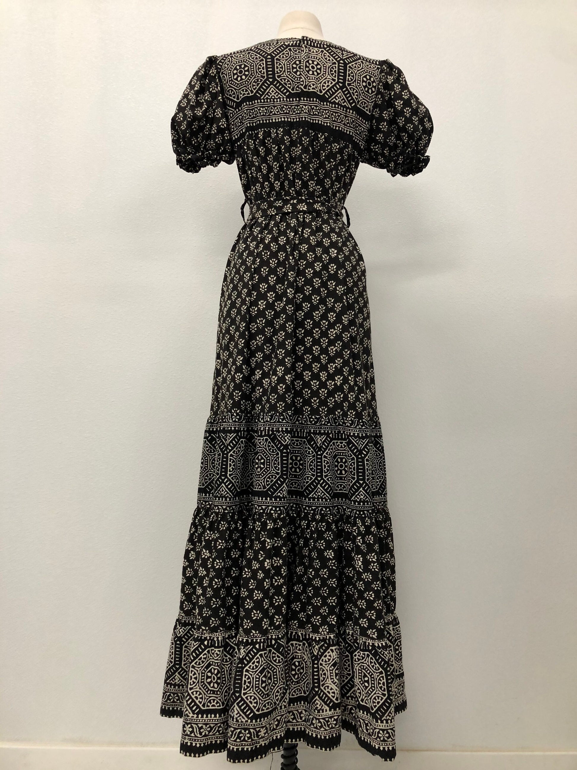 Back zipper string belt white black short sleeve long dress cotton made in pakistan block print women
