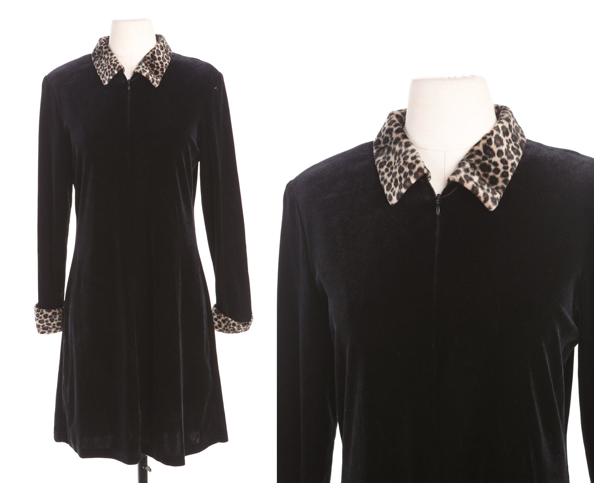 Black Velvet Dress with Leopard Print Collar and Cuffs - Era 90's - Y2K