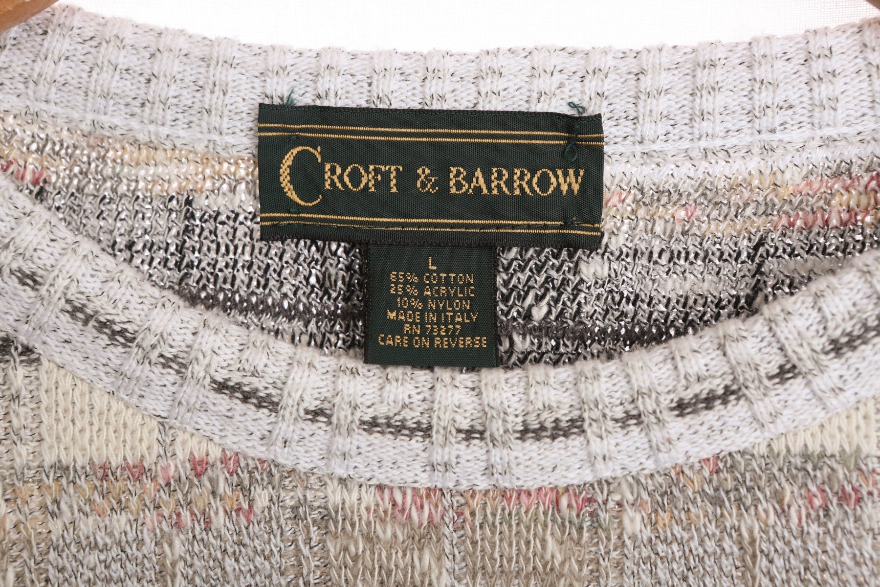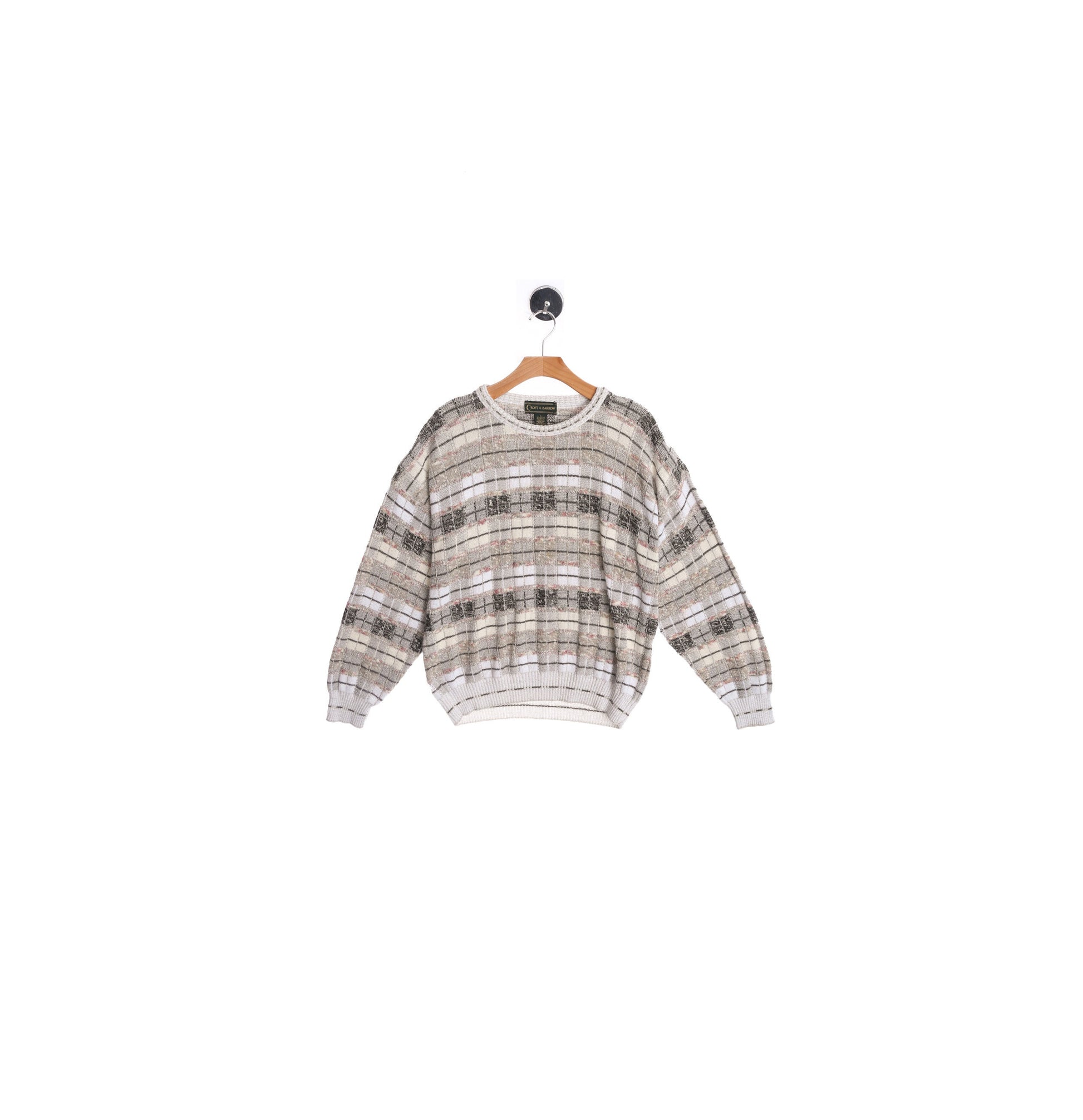 Men 90's Crew Neck Sweater - White and Beige Plaid Details