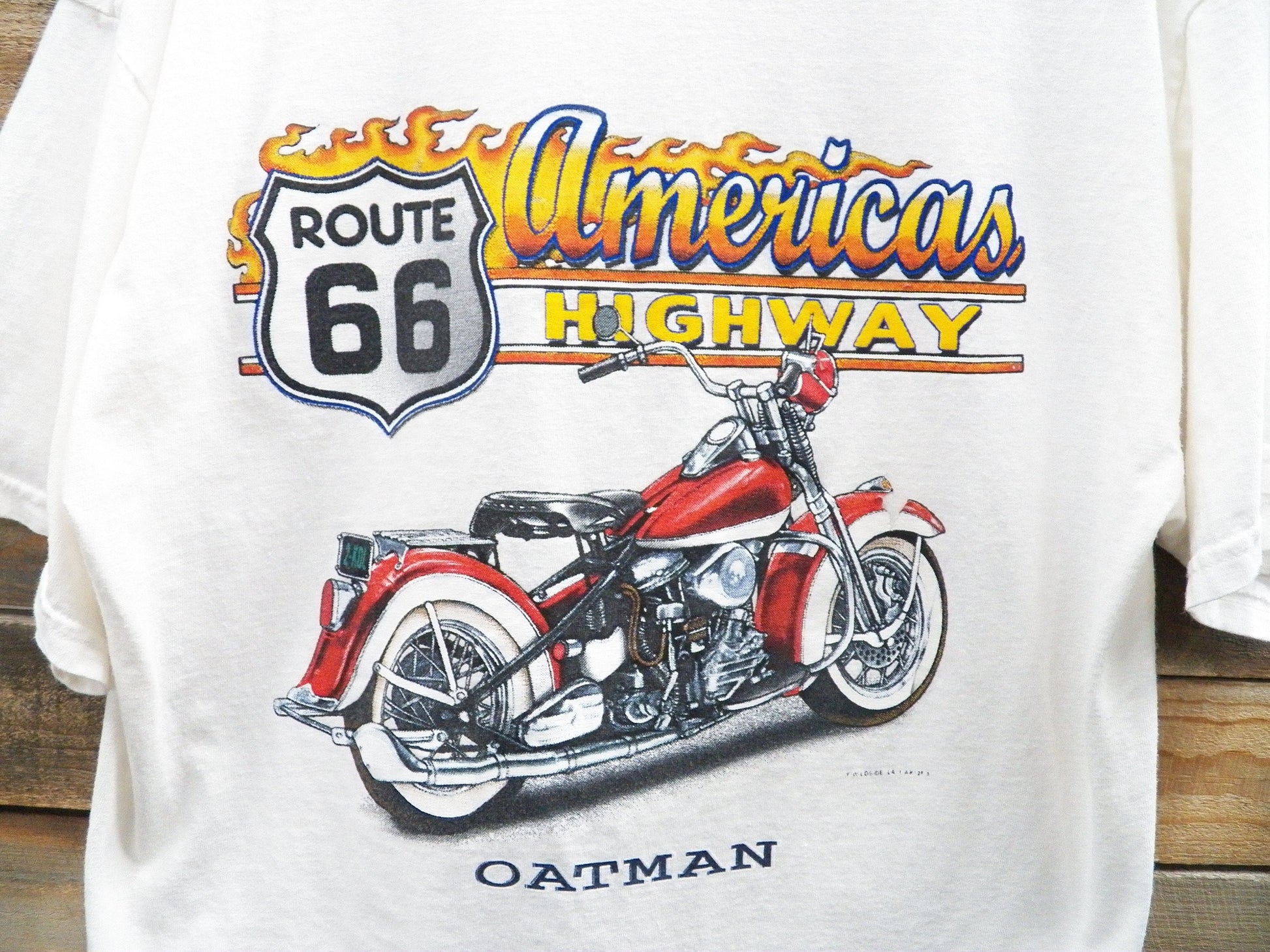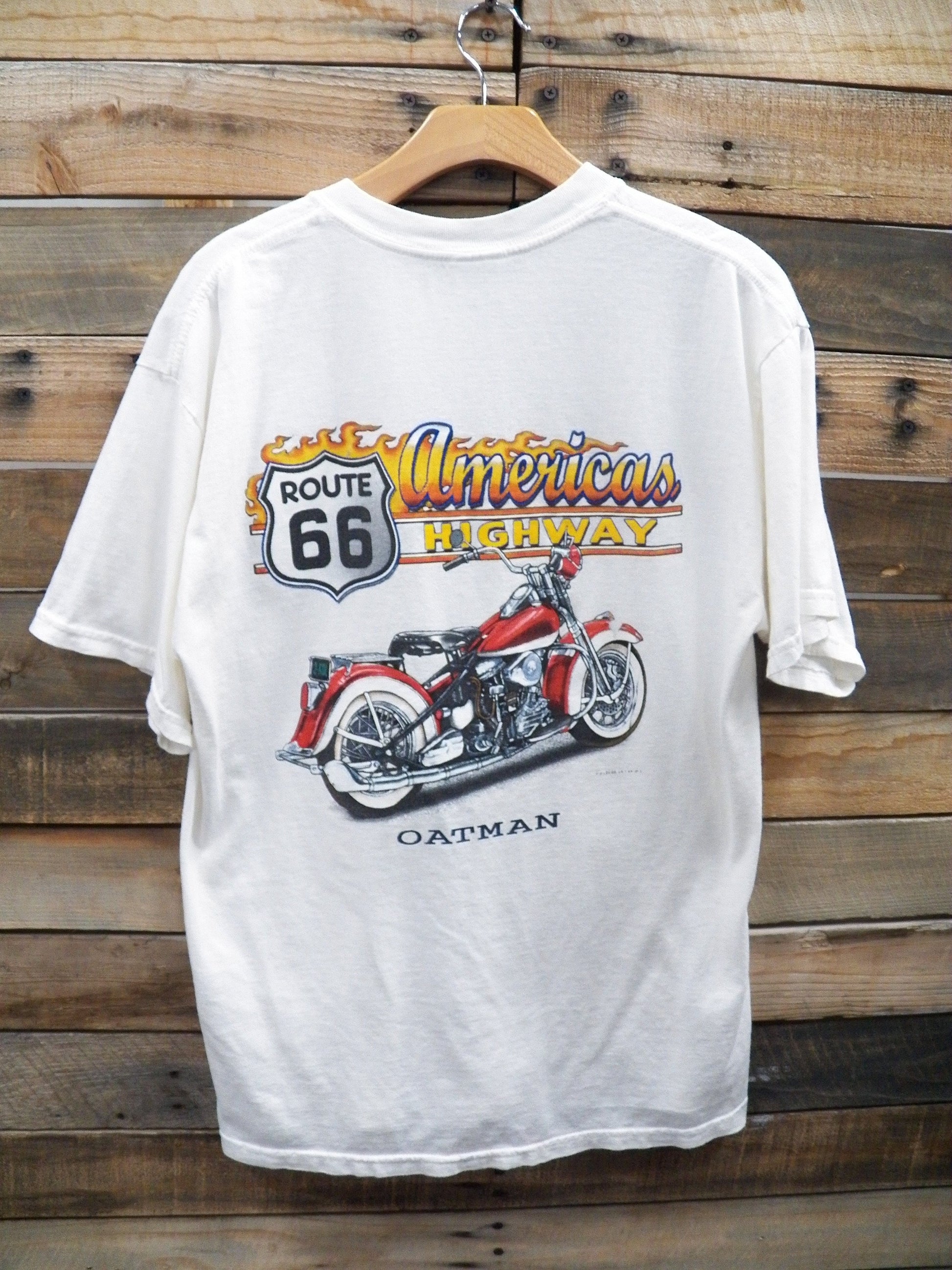 Route 66 vintage motorcycle t-shirt white americas highway oatman red flames