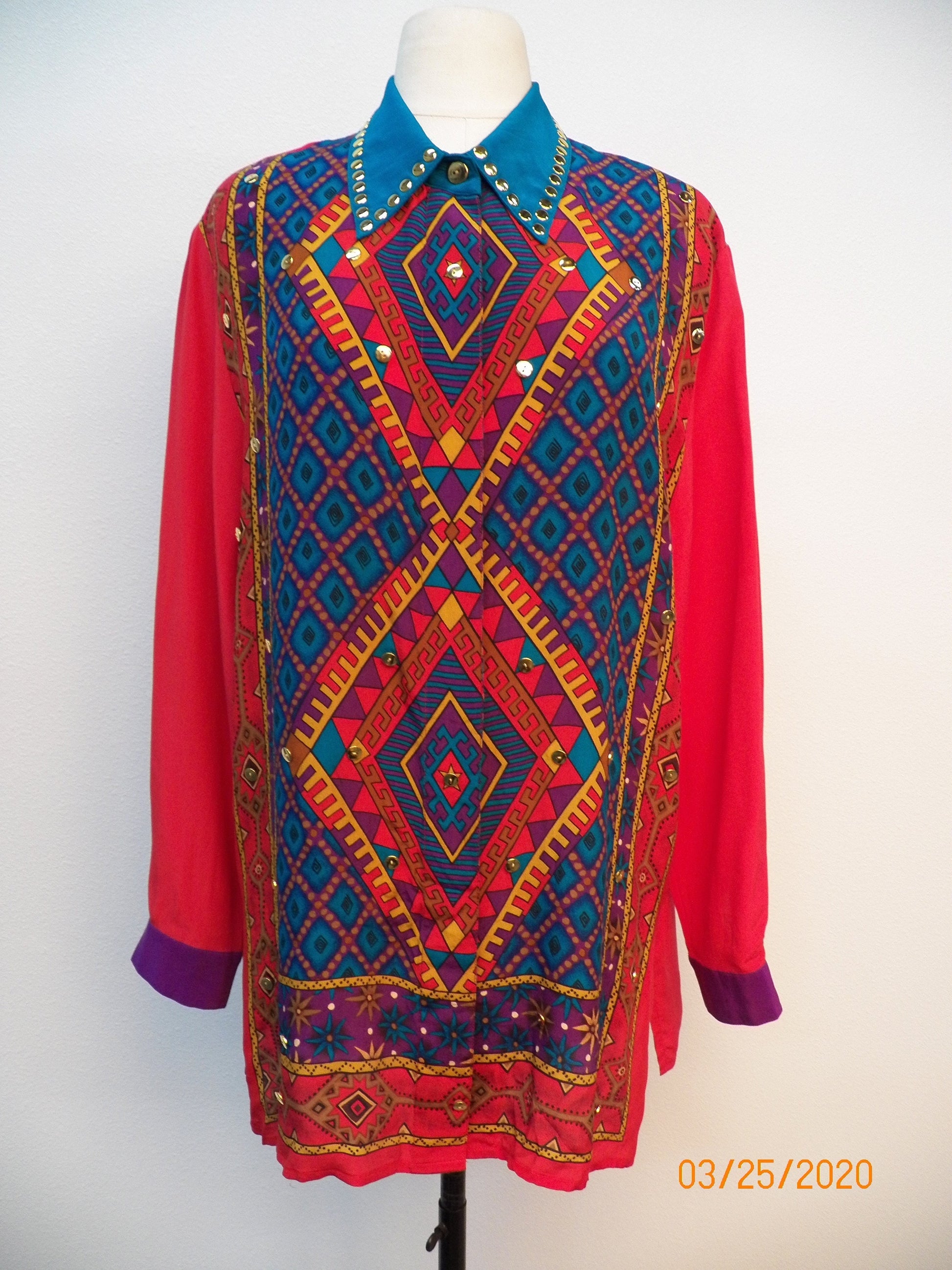 Silk graphic button up top blouse casual 90's women red diane gildman 80's y2k