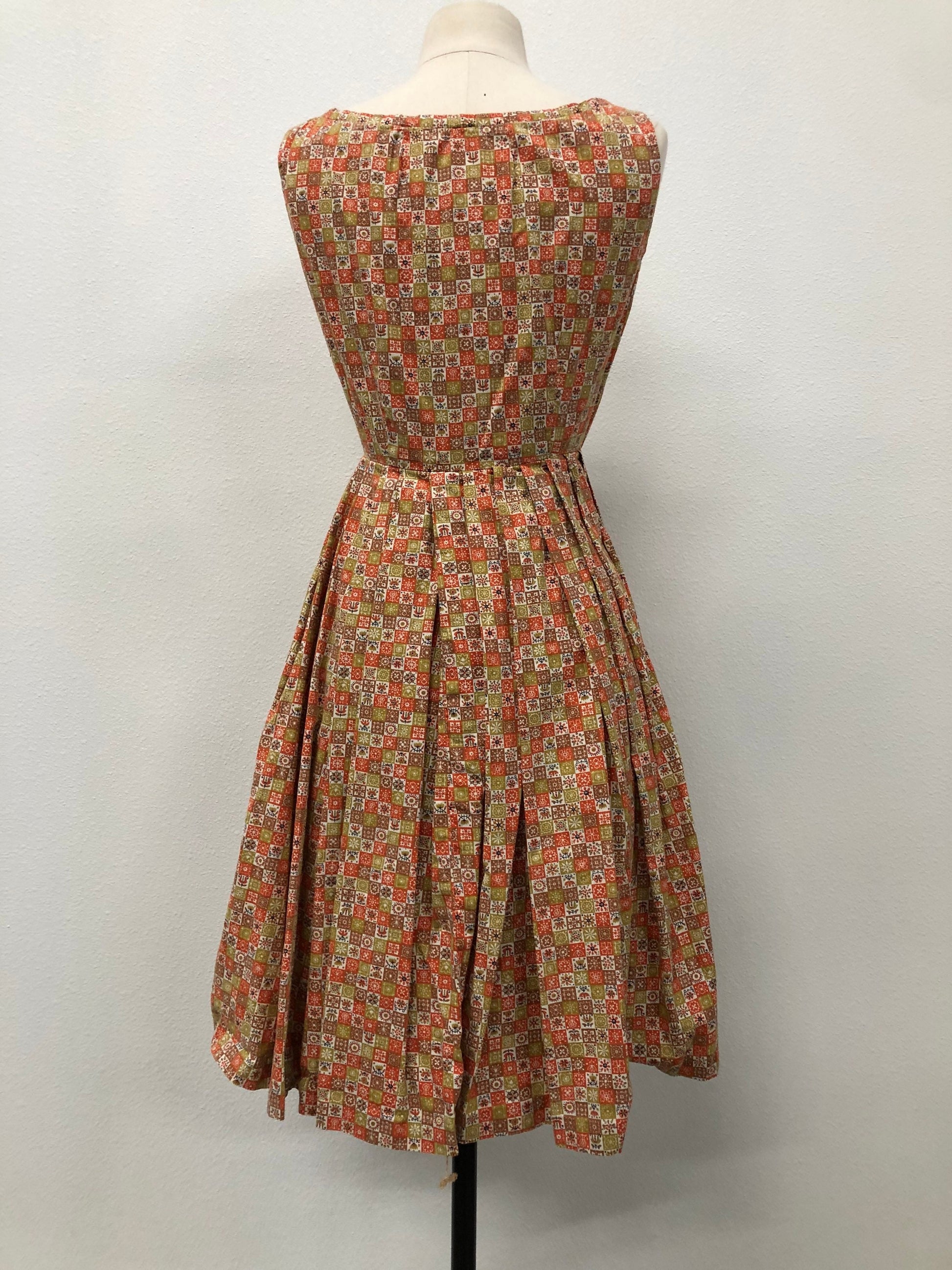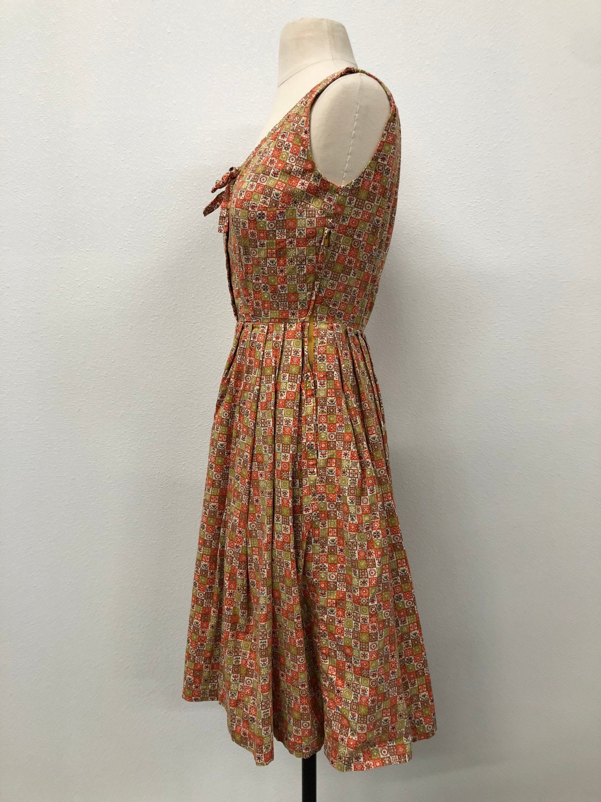Steel zipper sided zipper summer green orange geometric print vintage dress 50s women