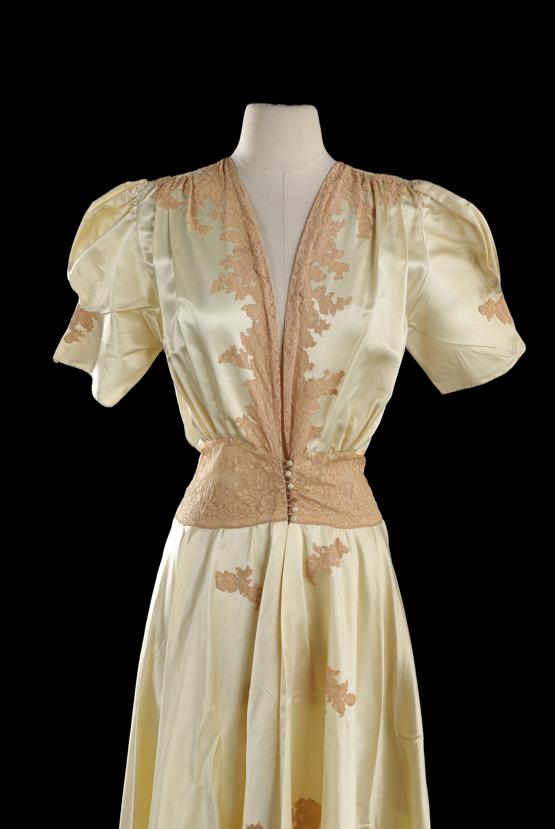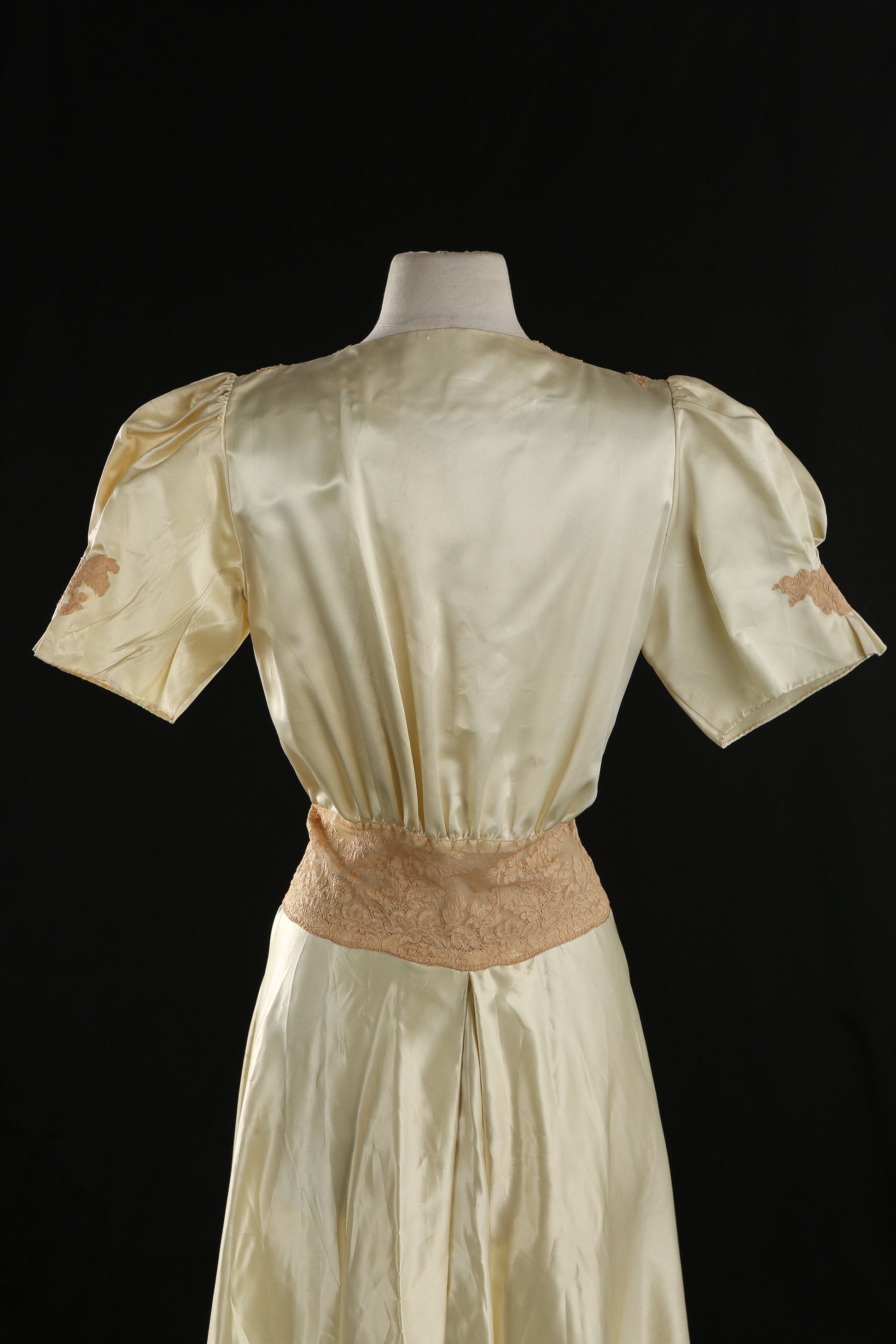 Vintage 1940s Yellow Nightgown Dress with Brown Lace Embroidered Details