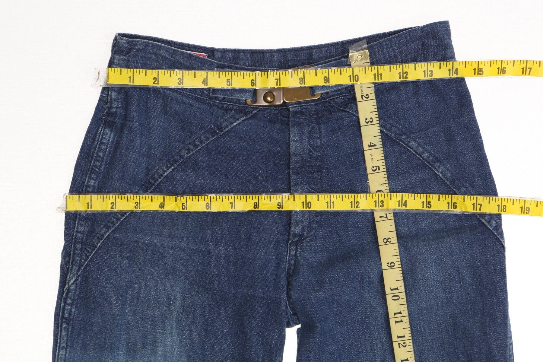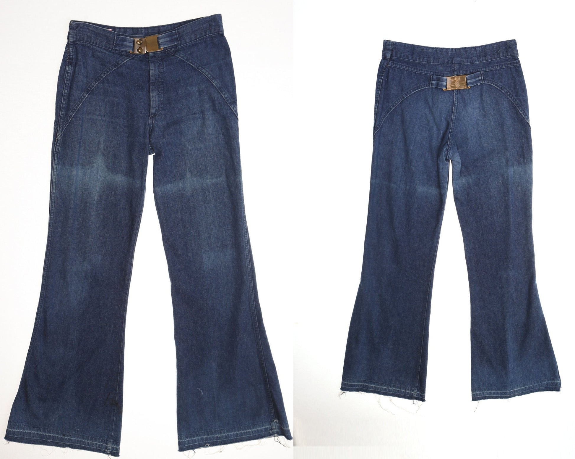 Vintage 70's bell bottom blue pants cotton tailpipes men women hippie high waist belt buckle