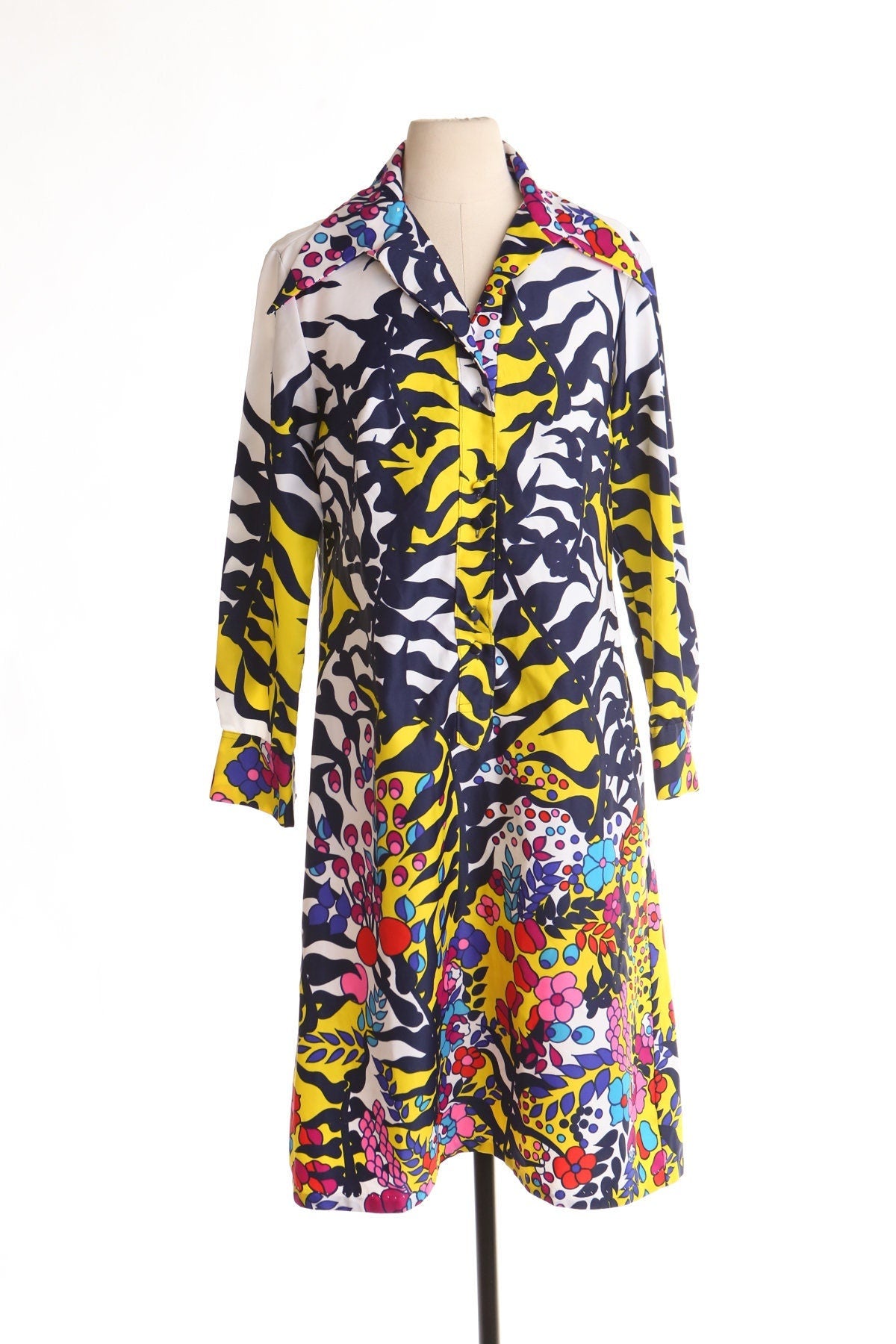 Vintage 70's floral print yellow white long sleeve mod disco dress hippie 60's