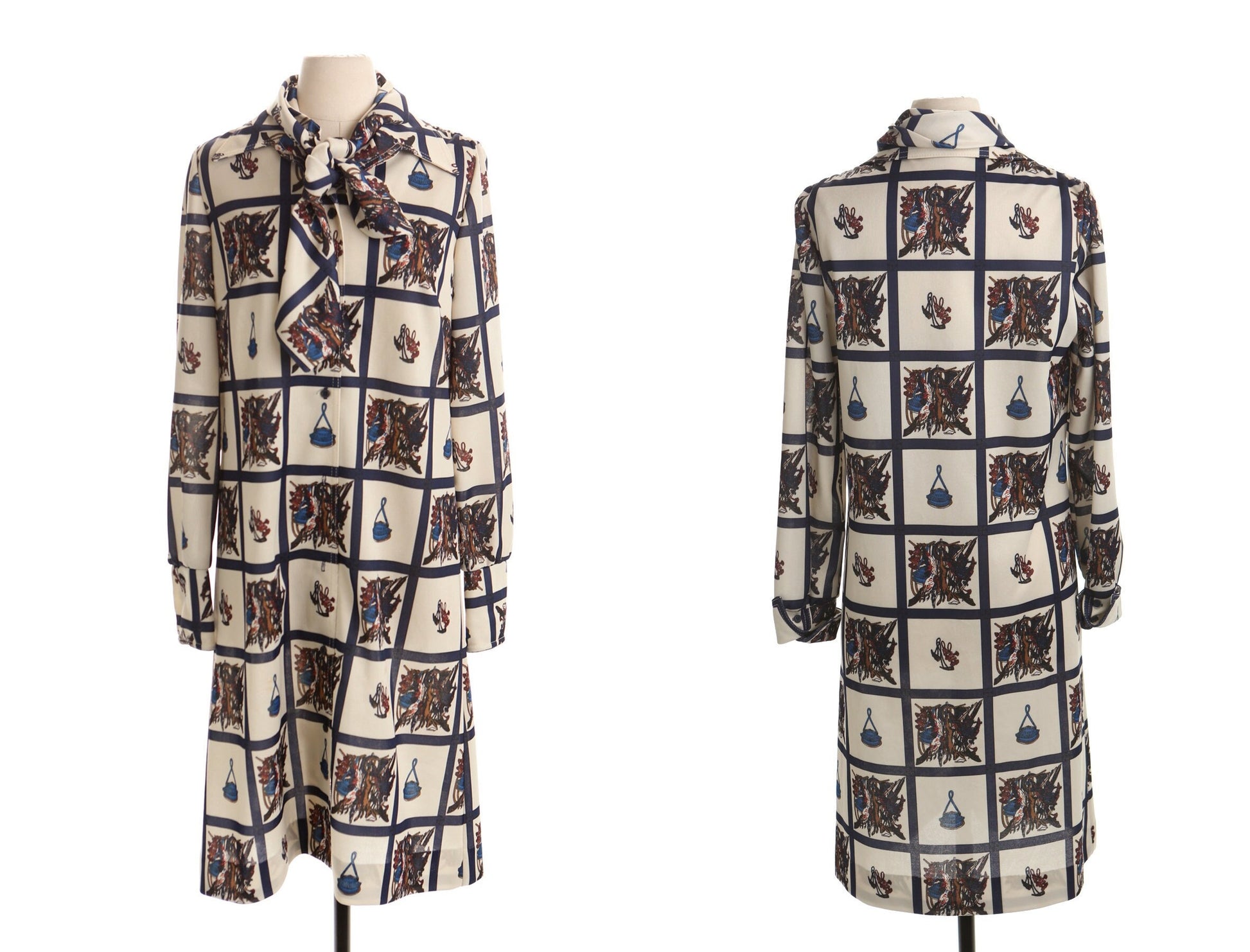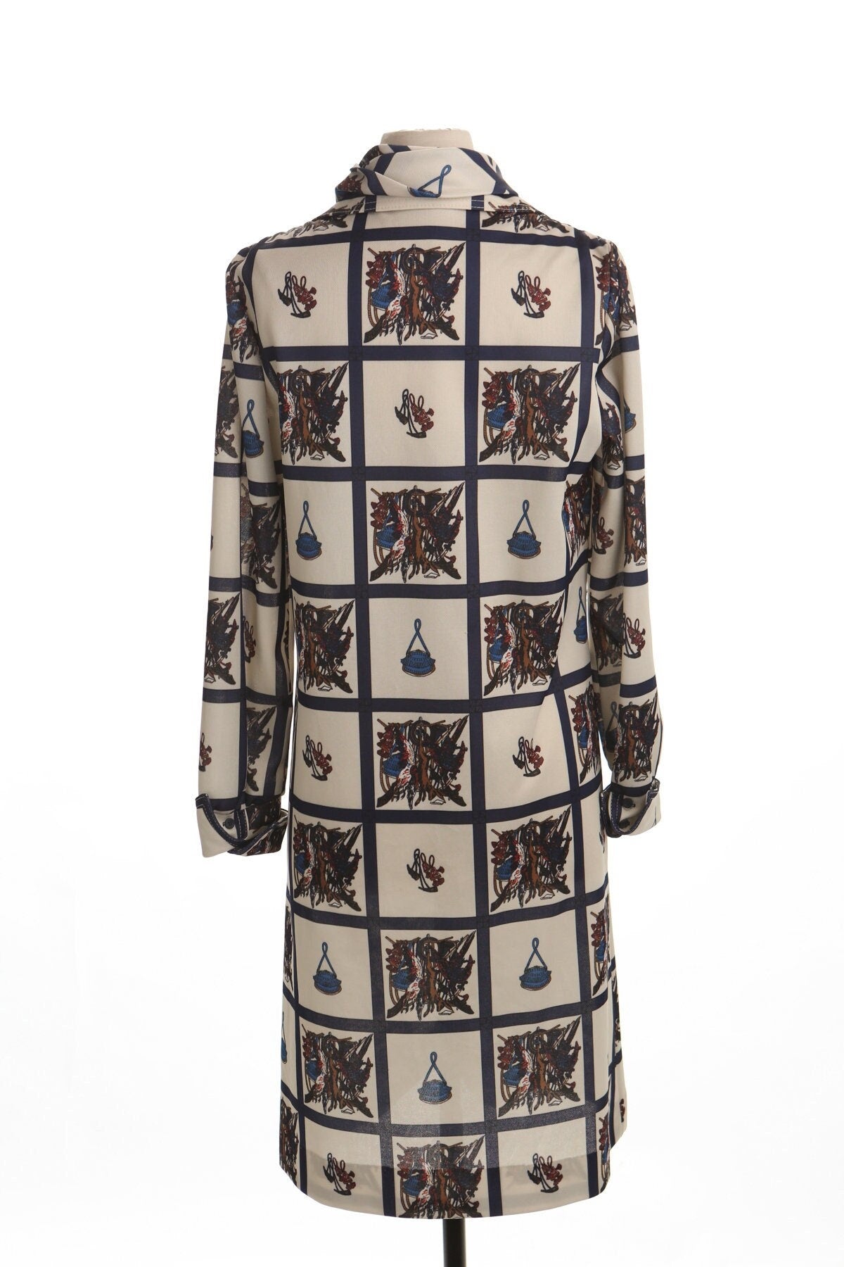 Vintage 70's summer beige casual dress women 60's mod neck tie scarf