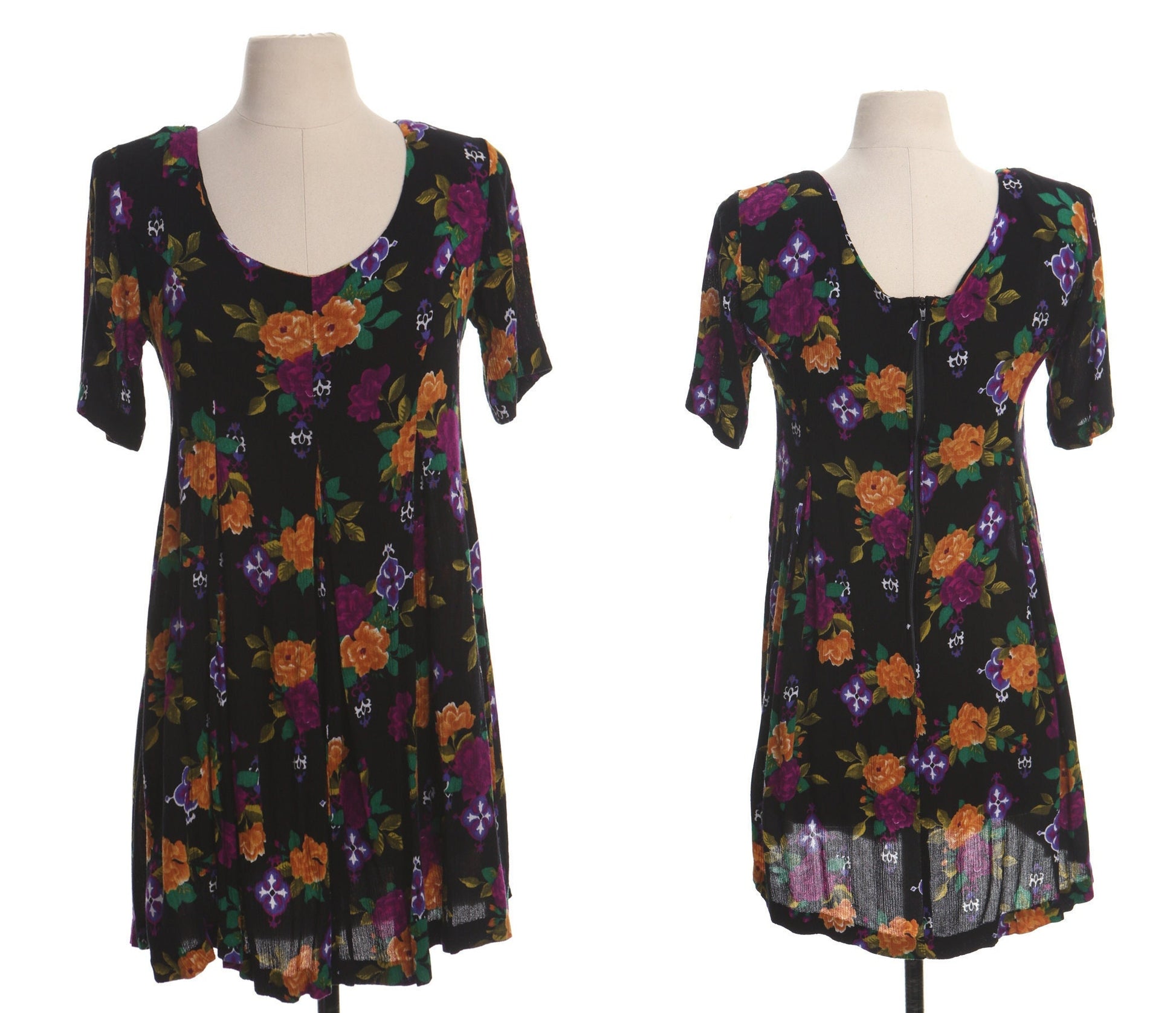 Vintage 90's floral print summer dress maxi rayon spring short sleeve black