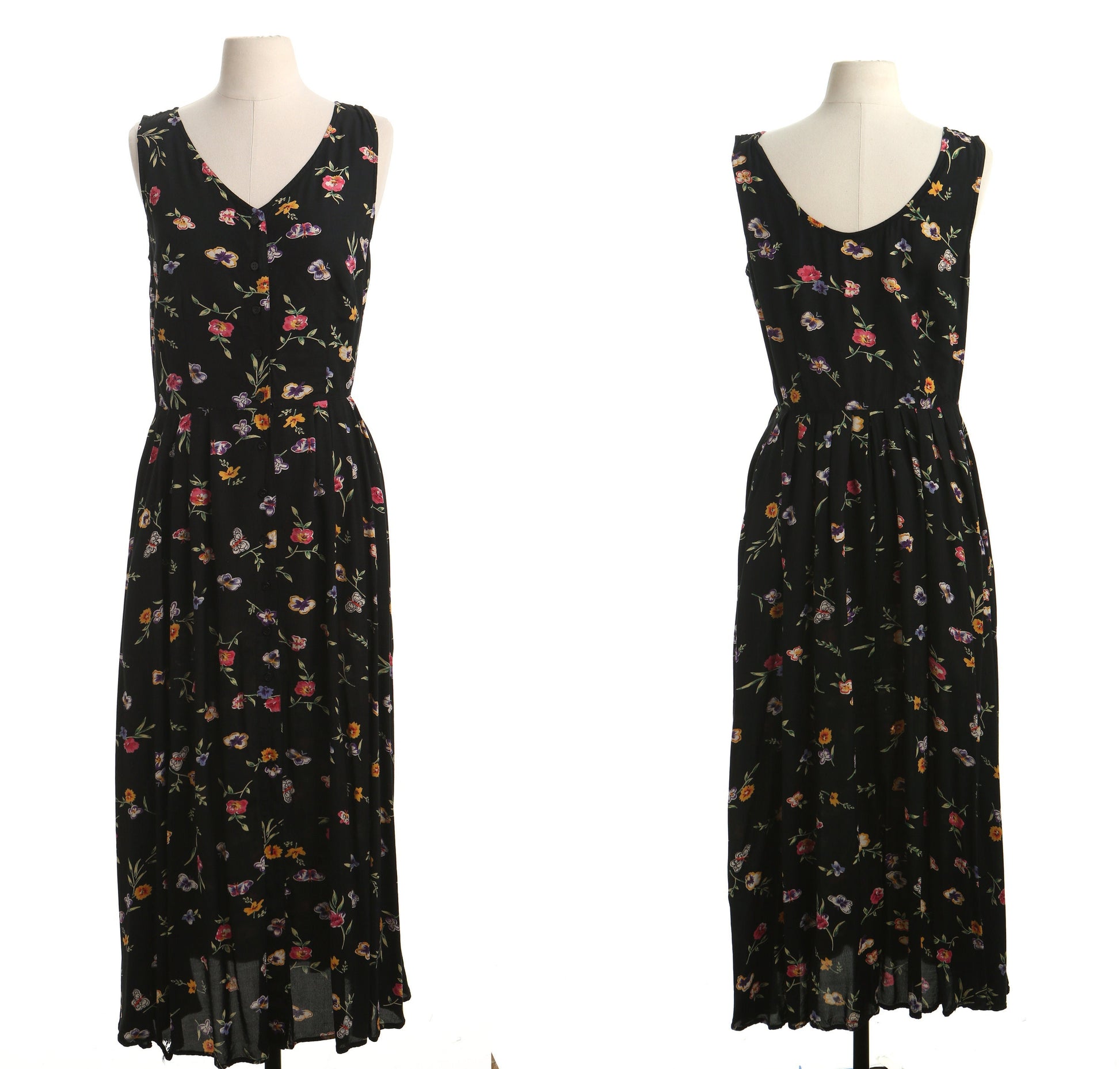 Vintage 90's summer maxi dress women floral black flower button up y2k