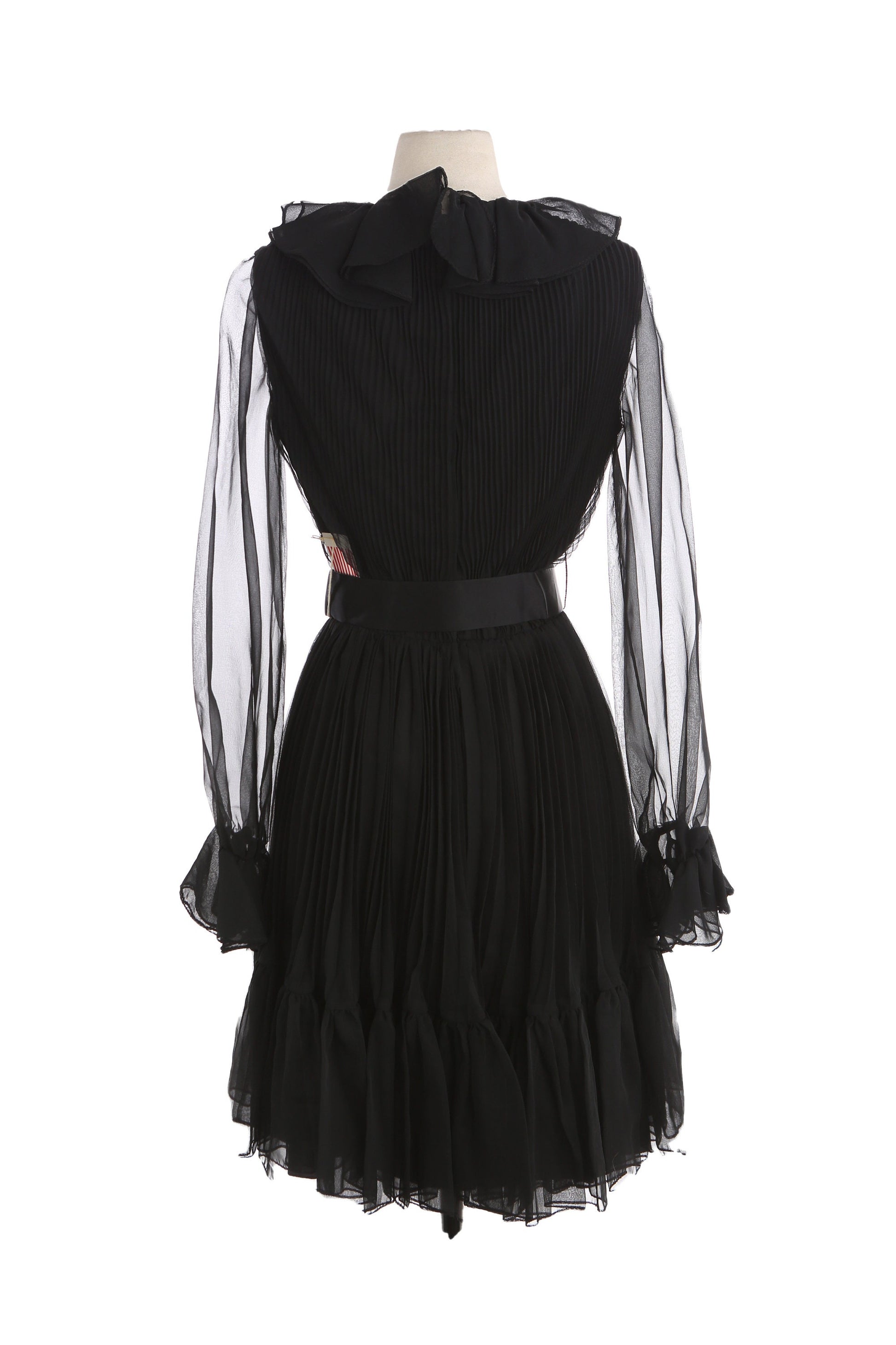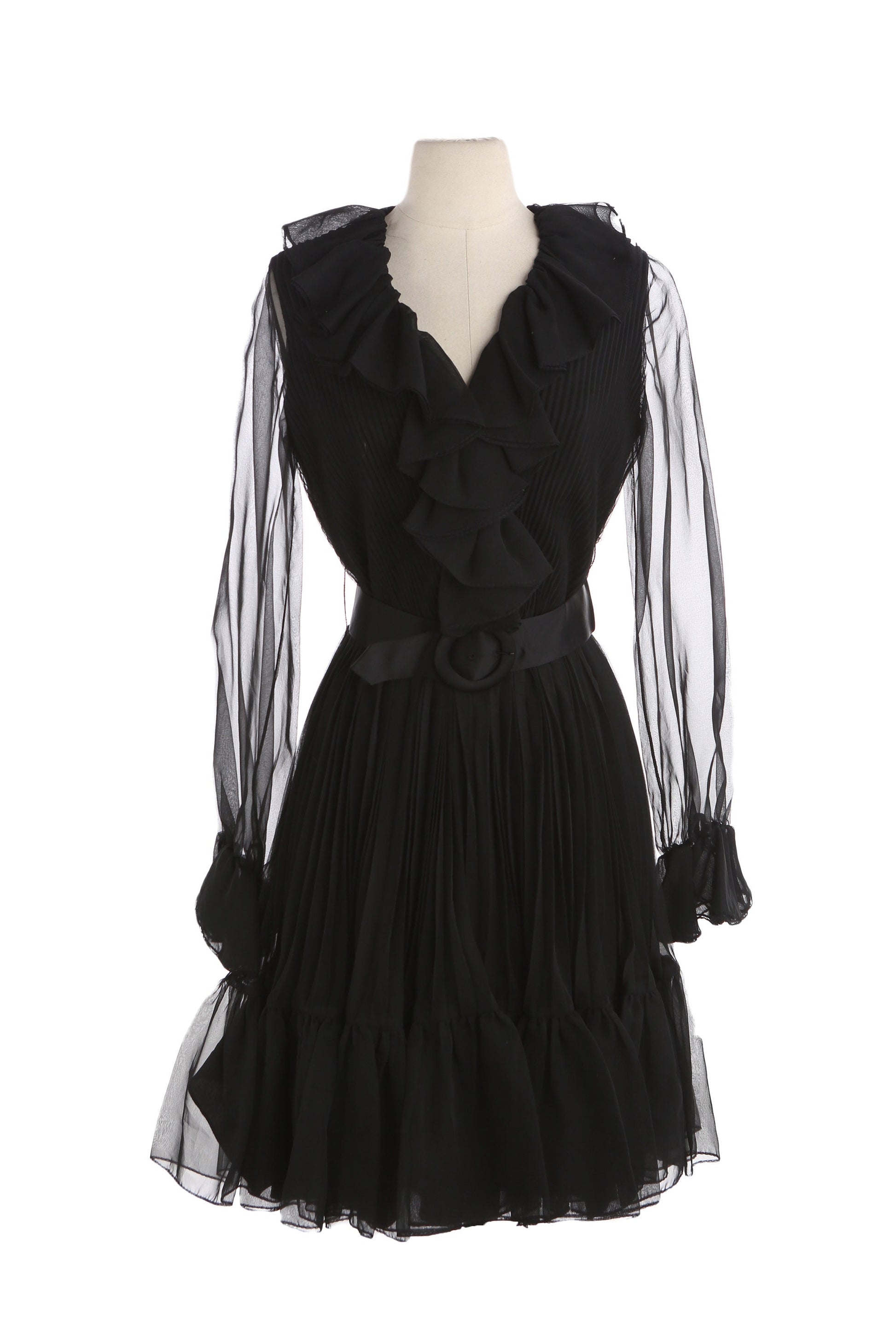 Vintage Black Pleated Bottom Dress with Ruffled Collar Seam / estimated Era: 70s - 80s