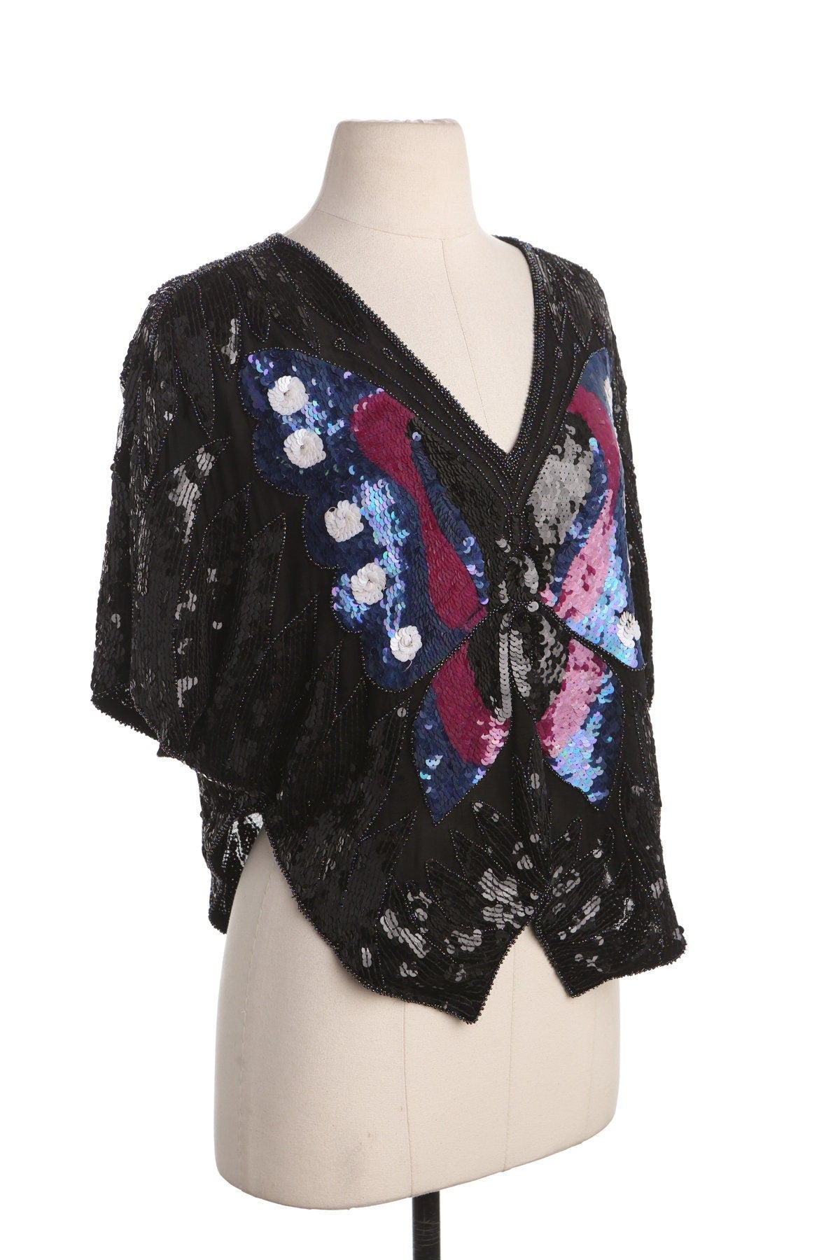 Vintage Black Sequin Top with Butterfly Design - Era (80's - 90's)