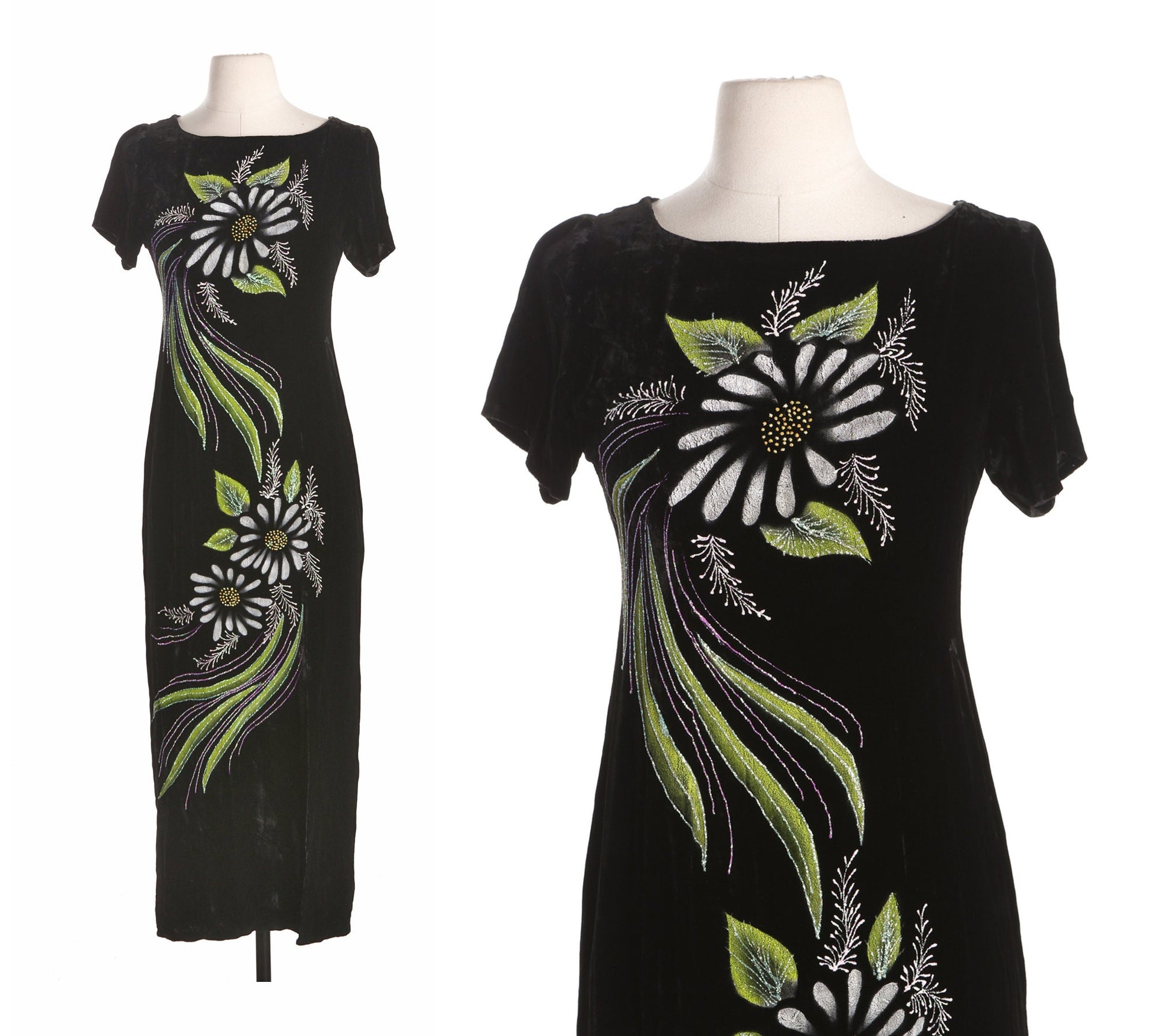 Vintage Black Velvet Dress with Hand Painted White Floral Designs