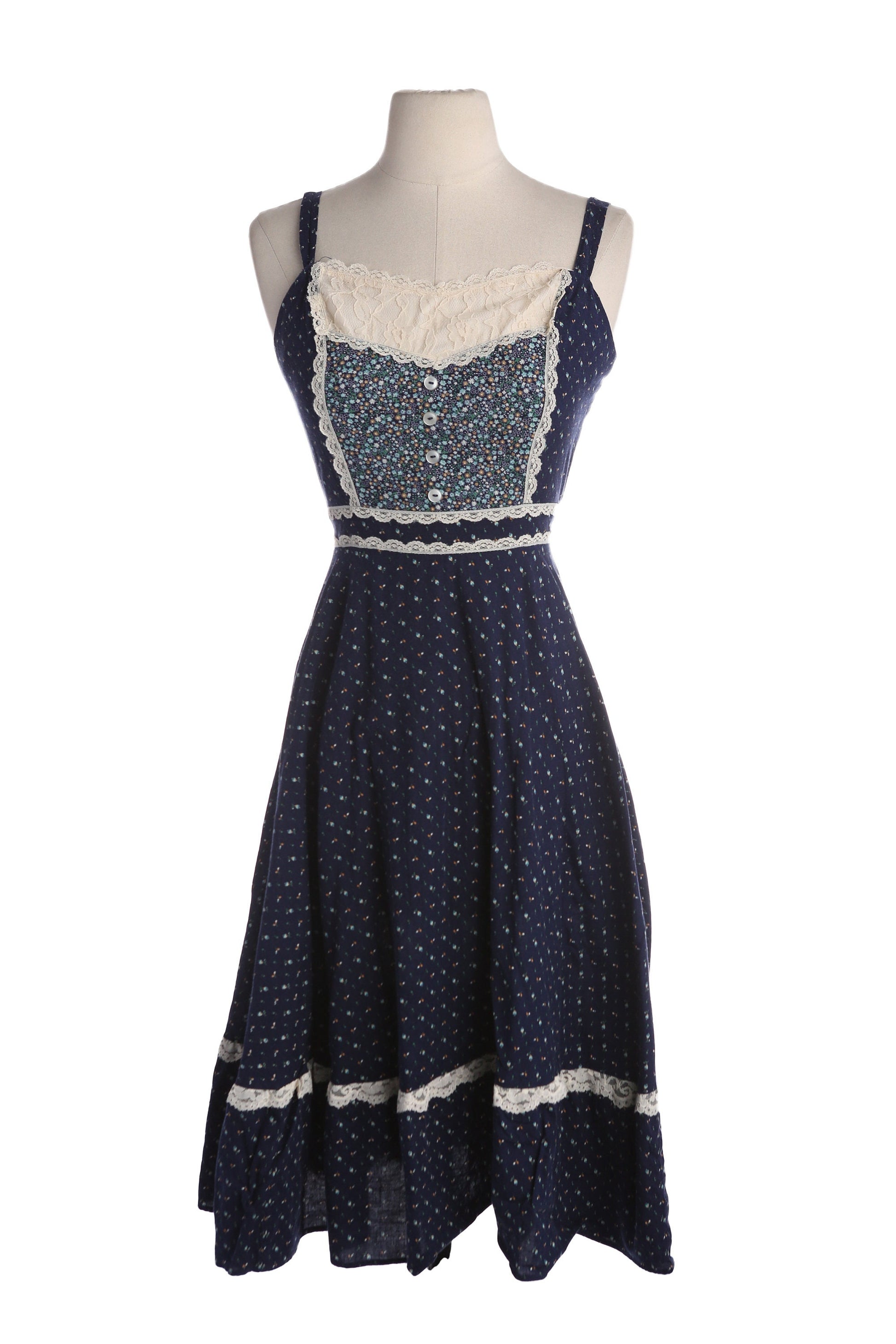 Vintage Blue Floral Print Cotton Prairie Dress - Estimated Era 1970's - 1980's