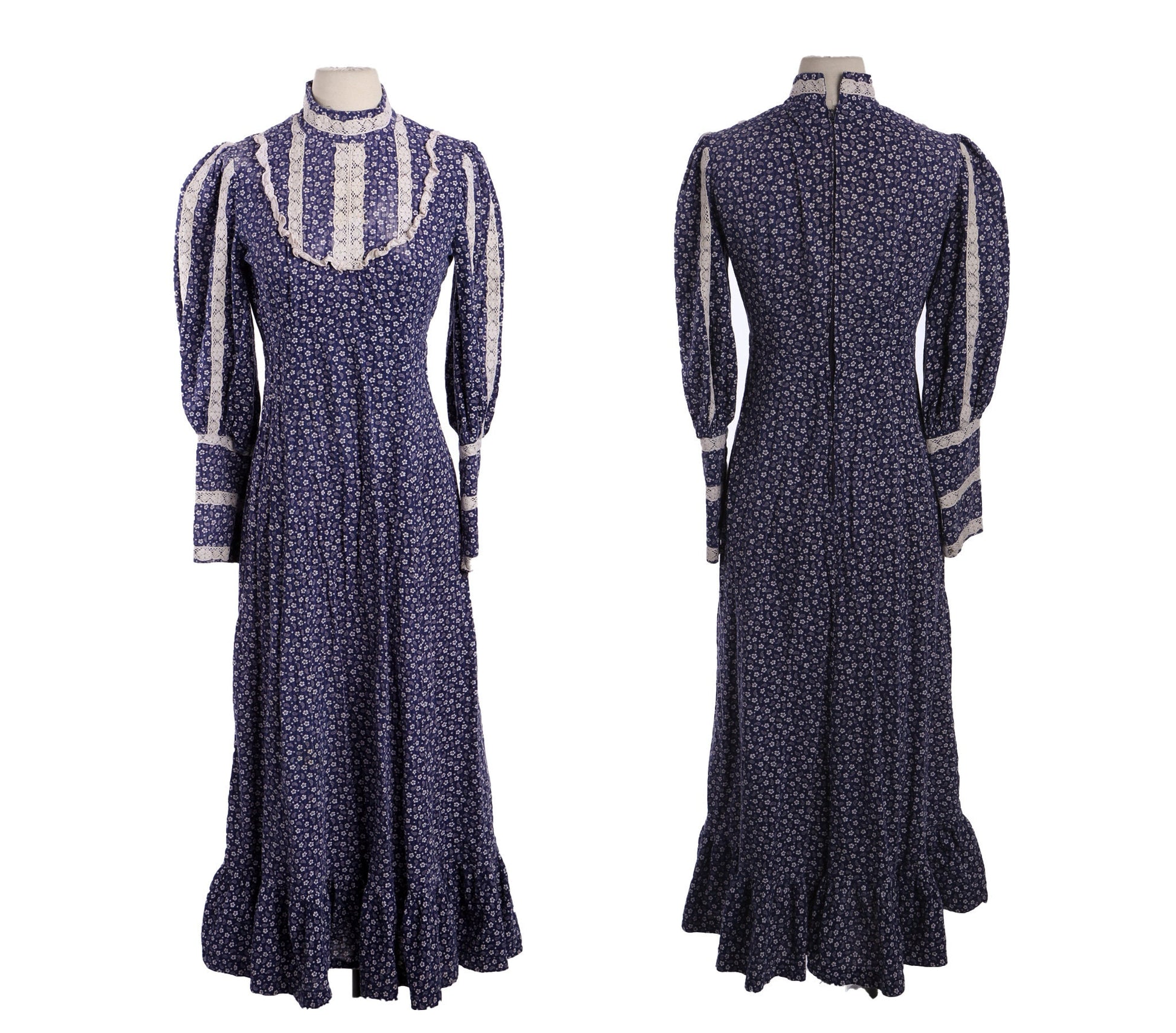 Vintage Blue Floral Print Long Prairie Dress - Era 70s - 80s