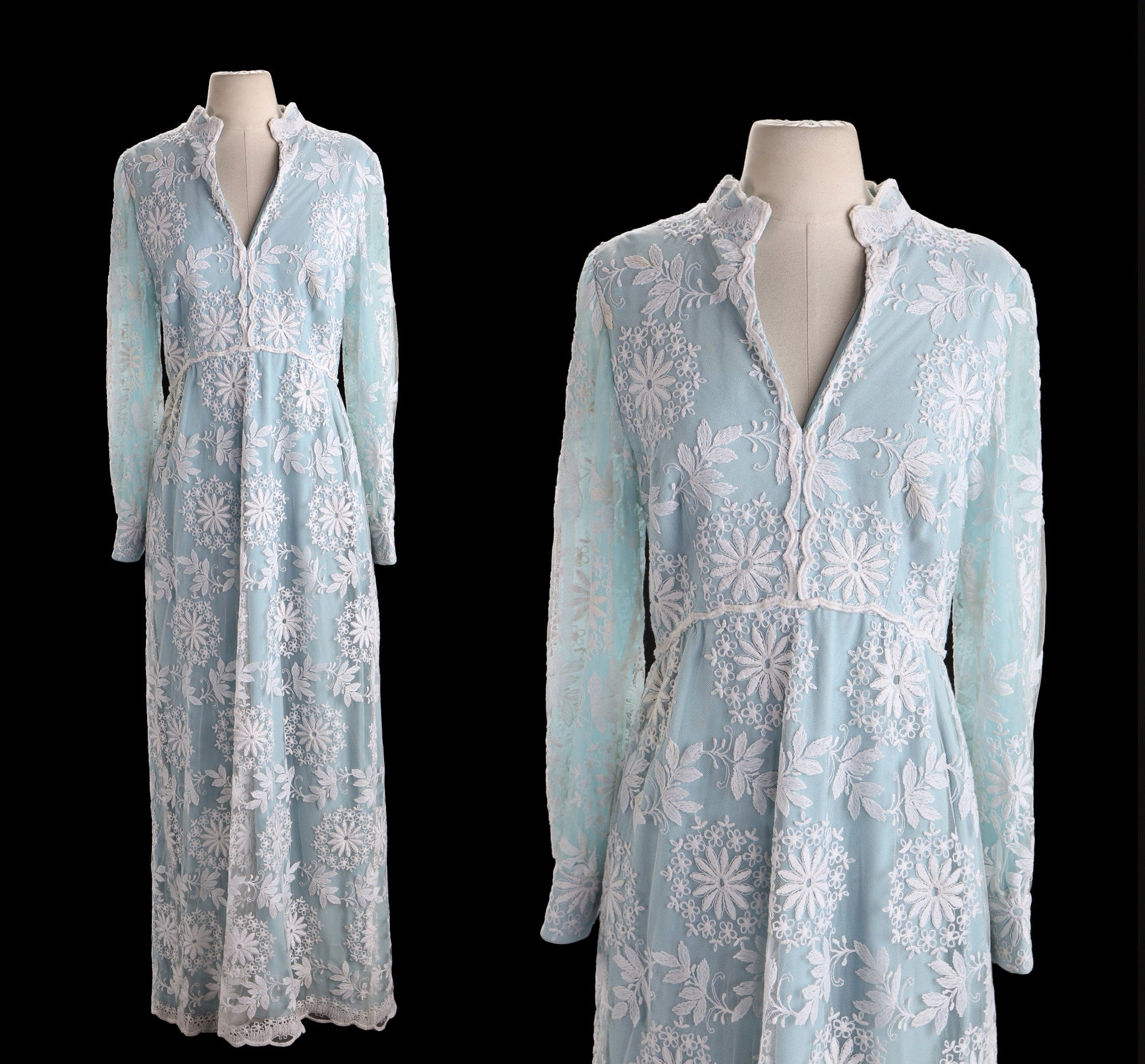 Vintage Blue Long Summer Dress with White Flower Embroidery