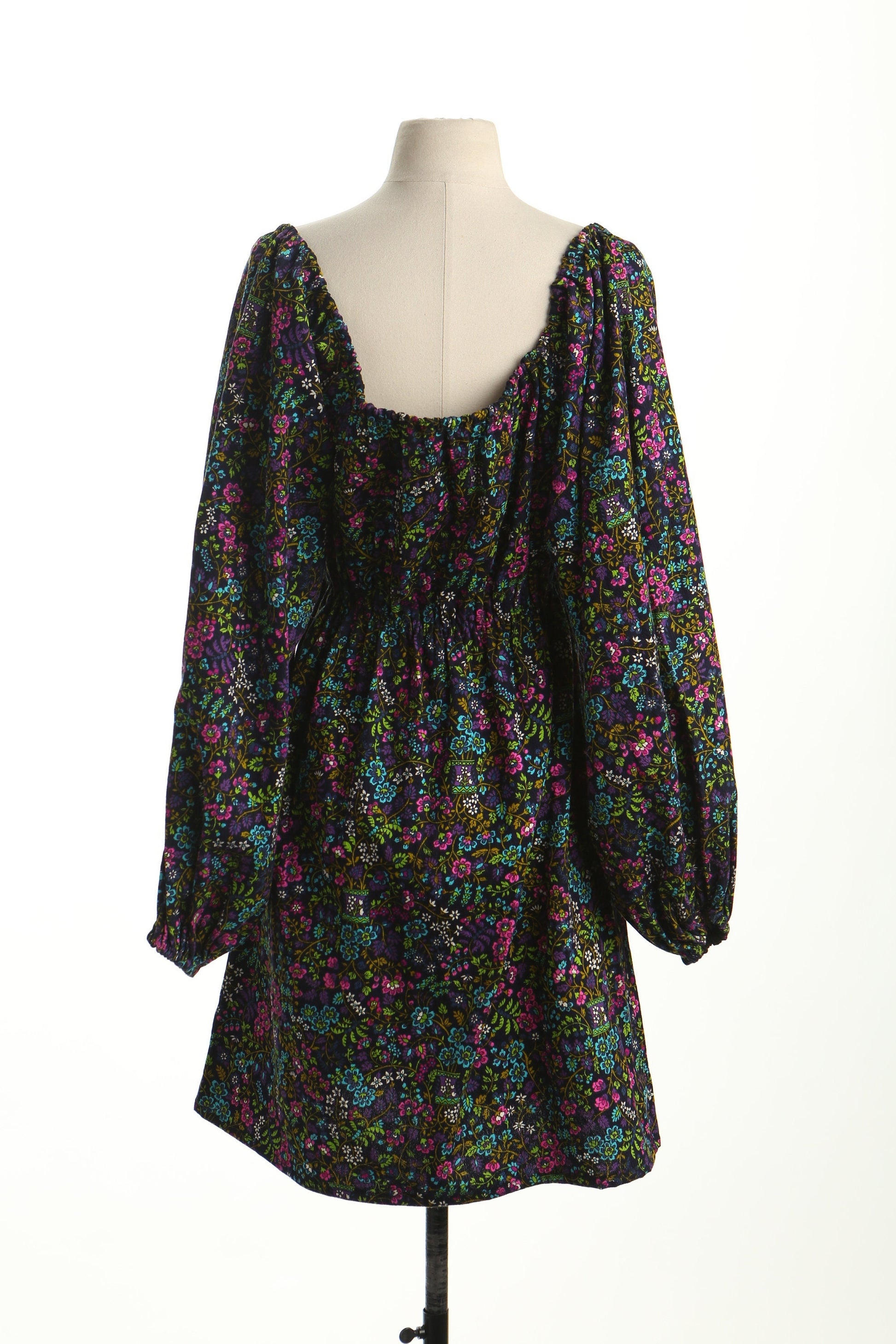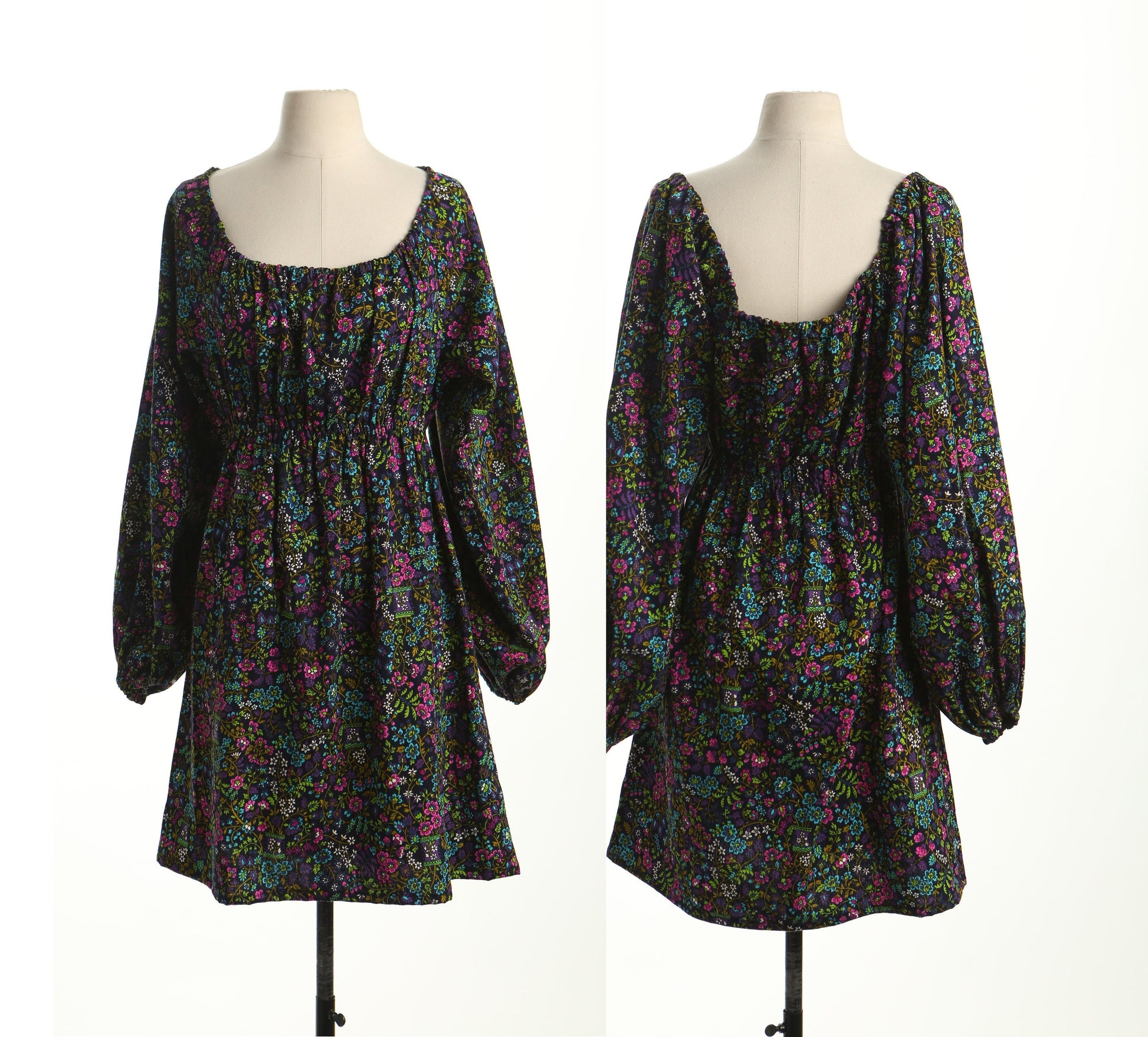 Vintage boho hippie summer floral print dress black off shoulder long sleeve 70's 60's