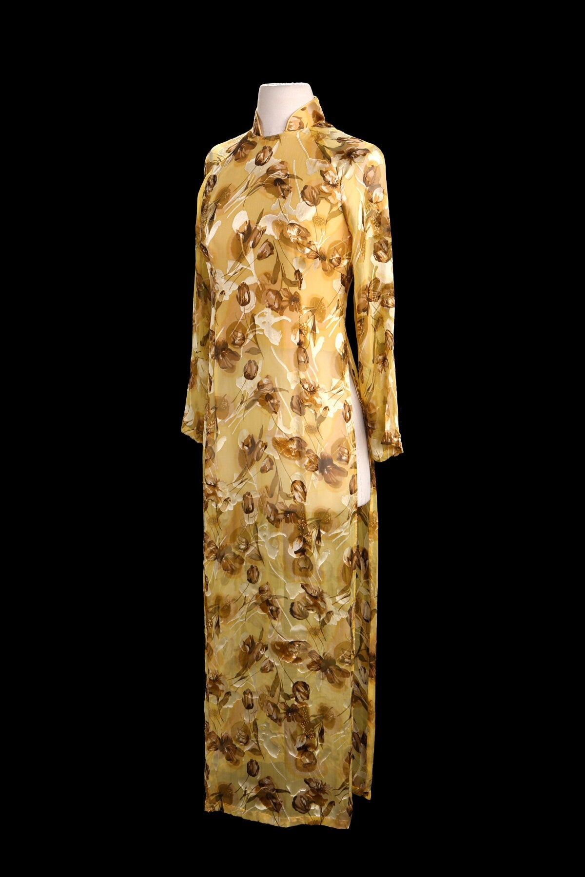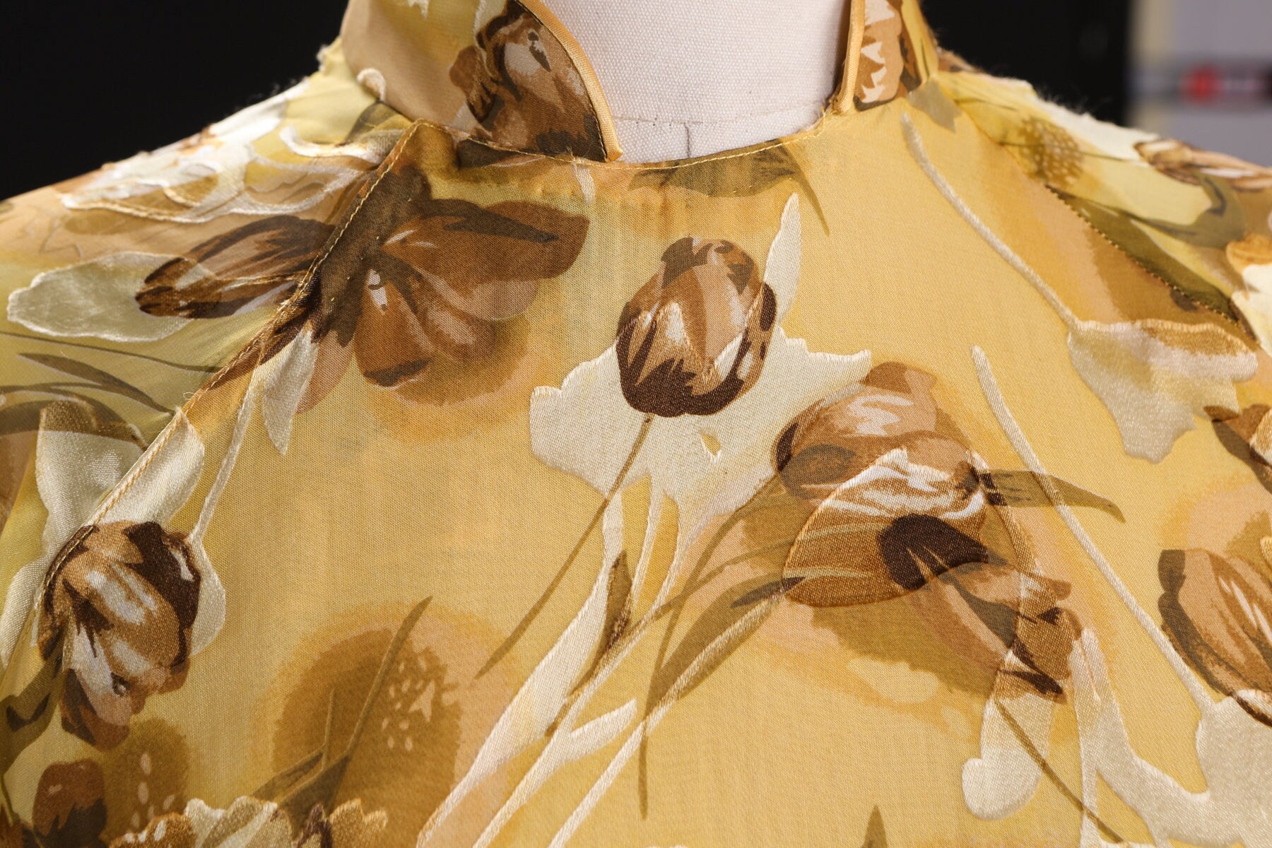 Vintage Cheongsam Dress with Yellow Flower Print Fabric Details