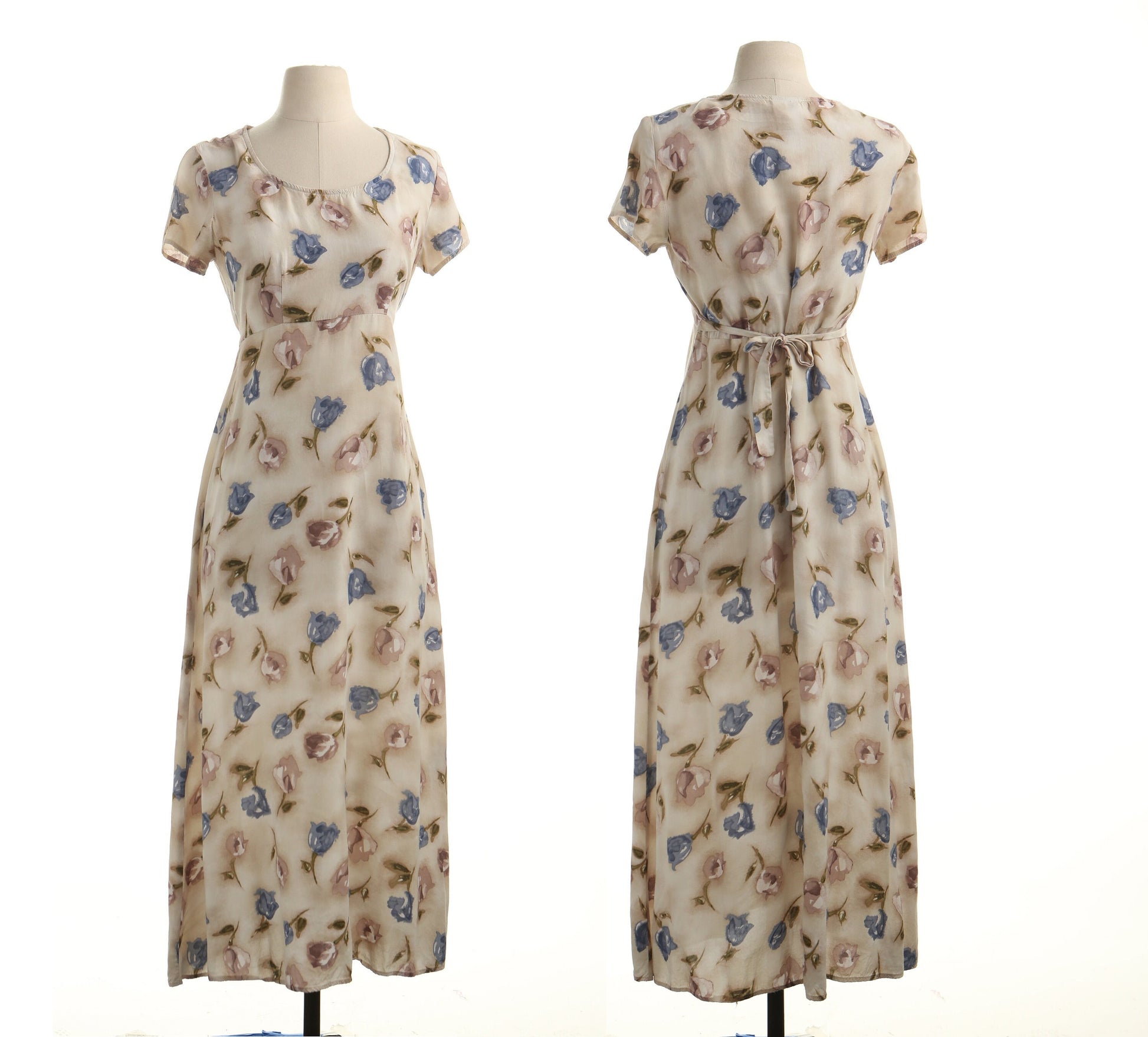 Vintage dress maxi rayon floral print 90's casual beige long roses flowert
