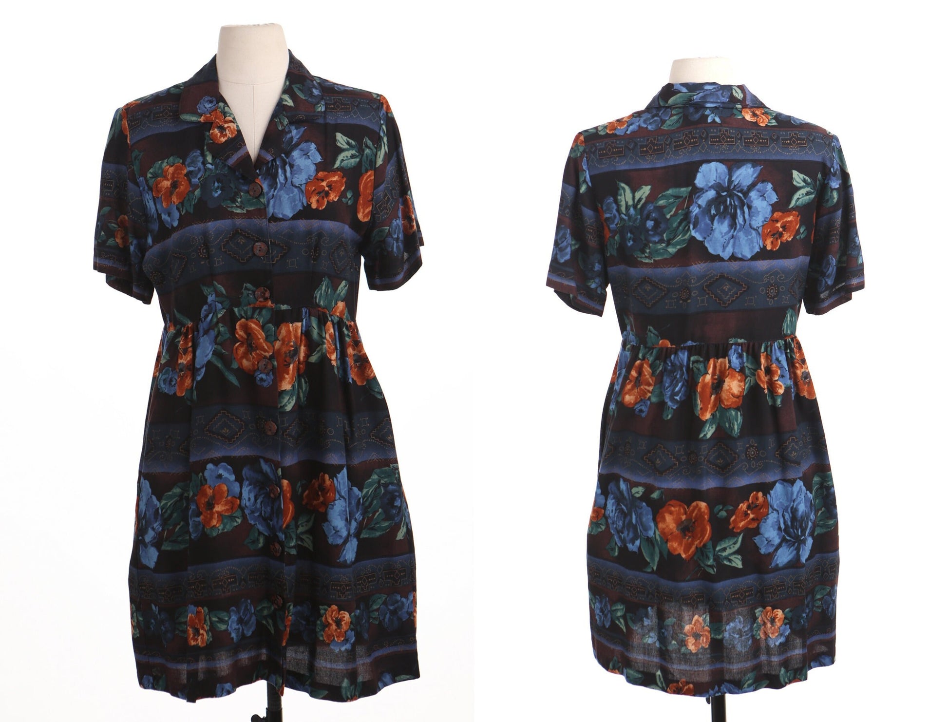 Vintage dress women casual summer black blue floral print button clousure rayon
