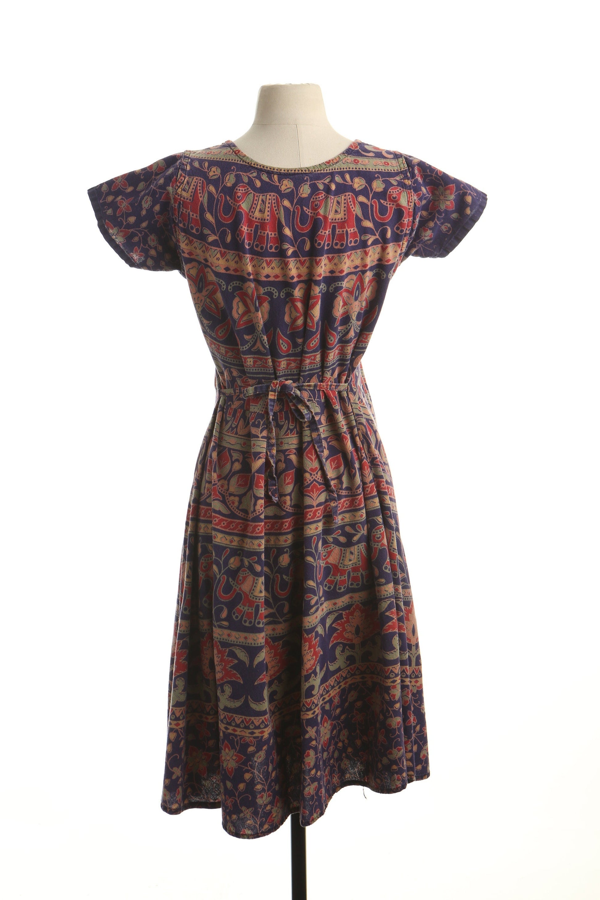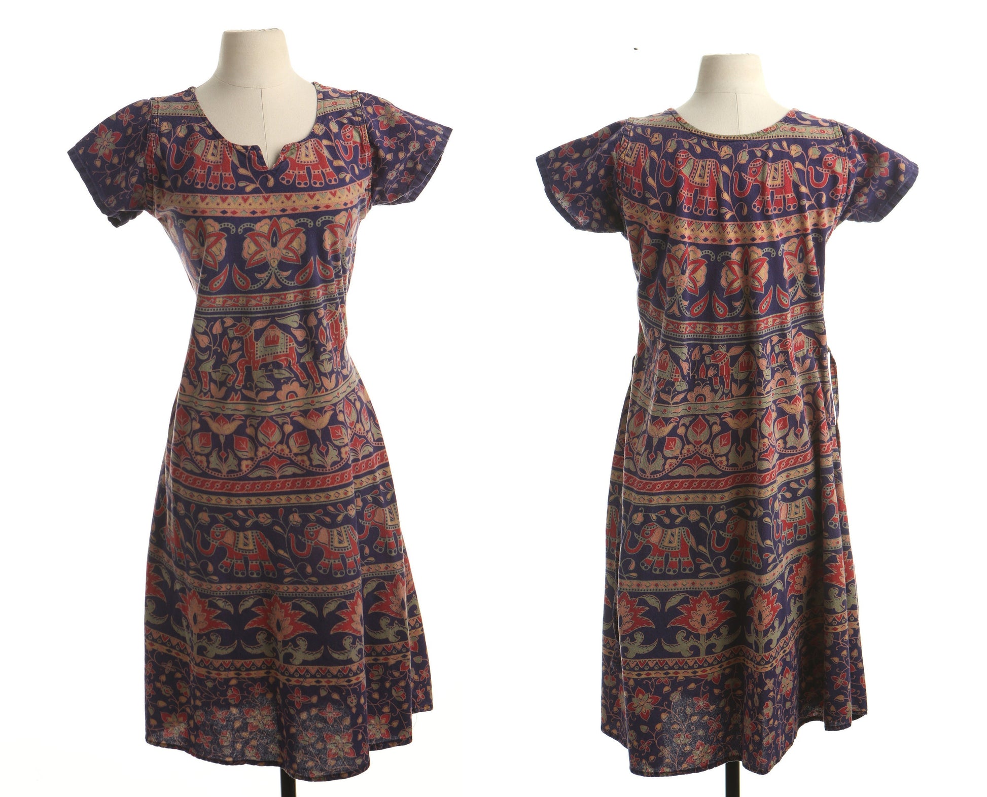 Vintage floral block print summer indian boho 70's dress women blue