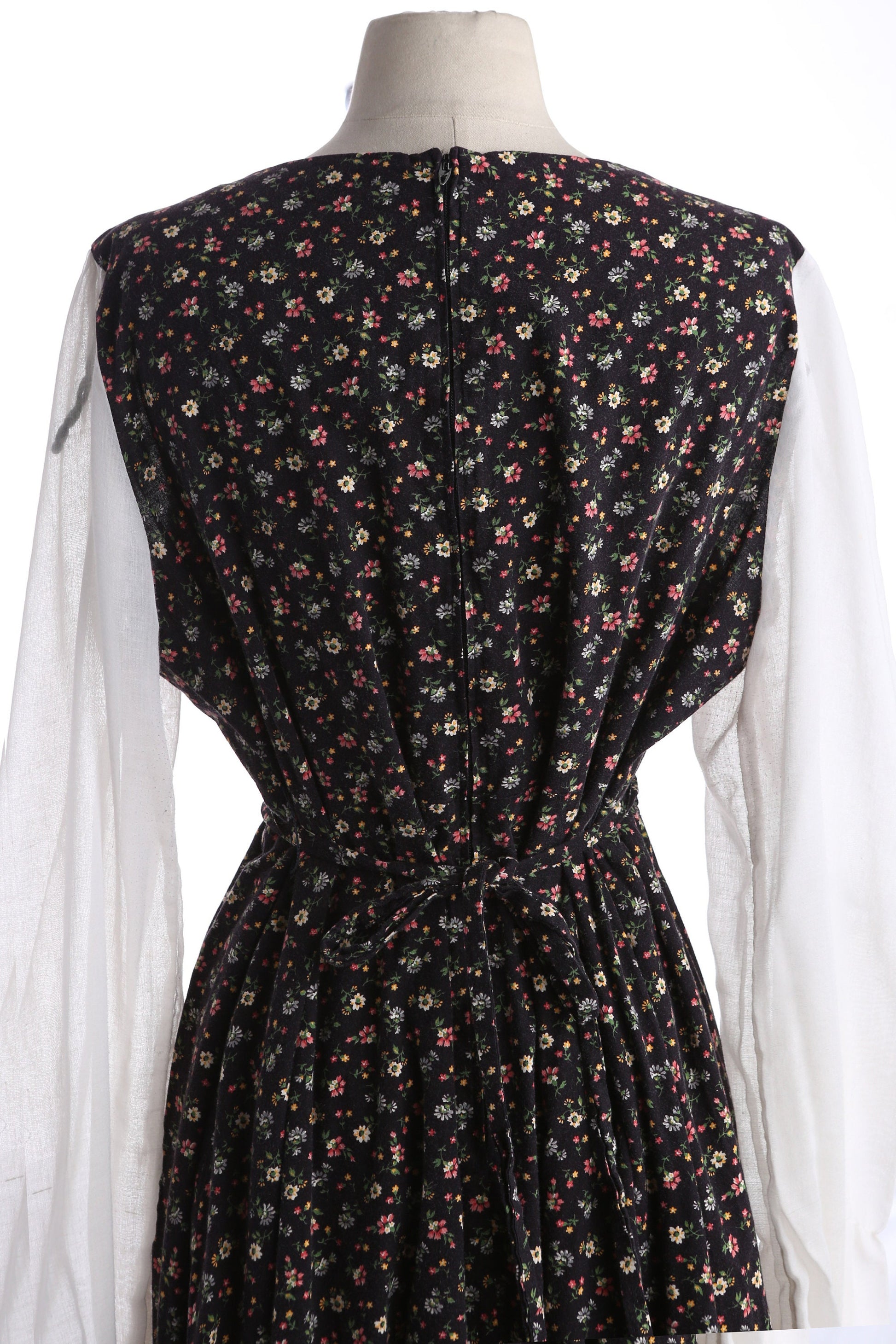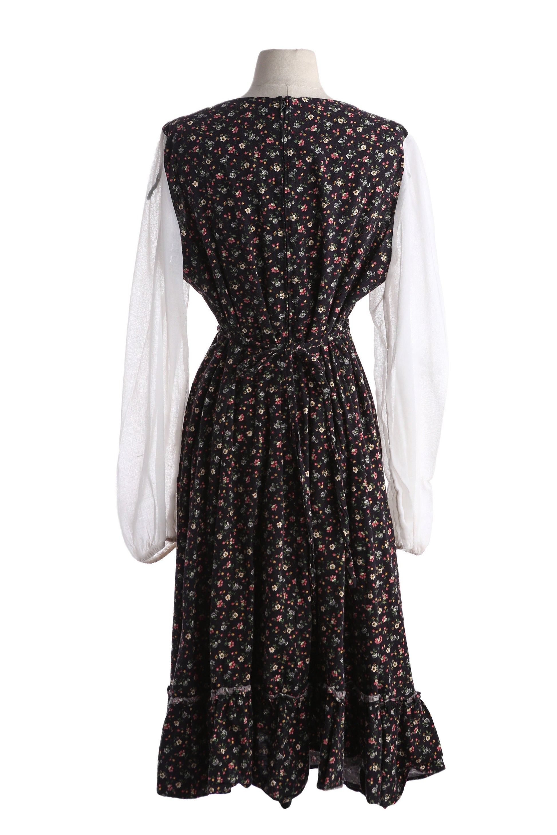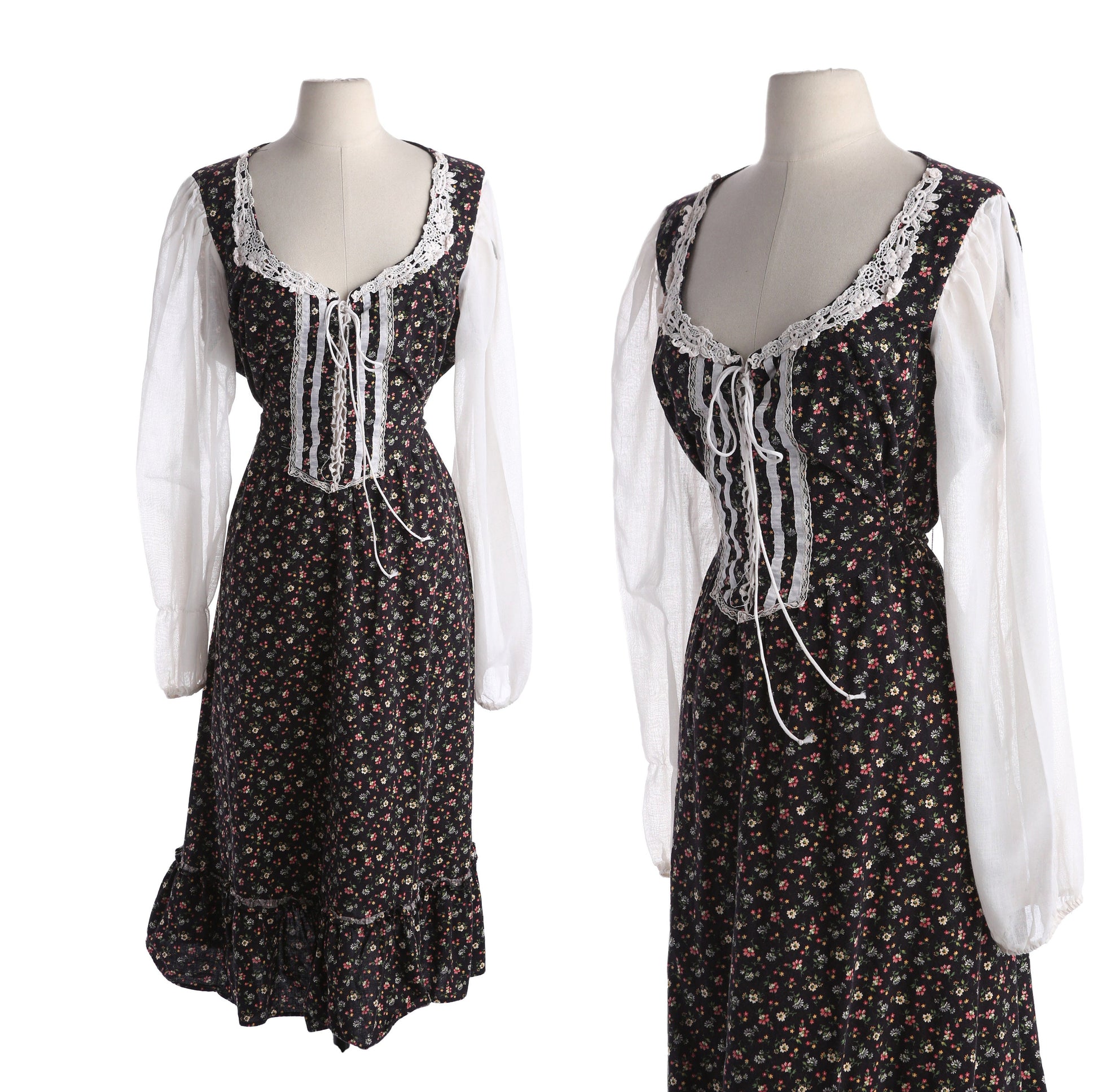 Vintage Floral Print Black Prairie Dress Long White Sleeves