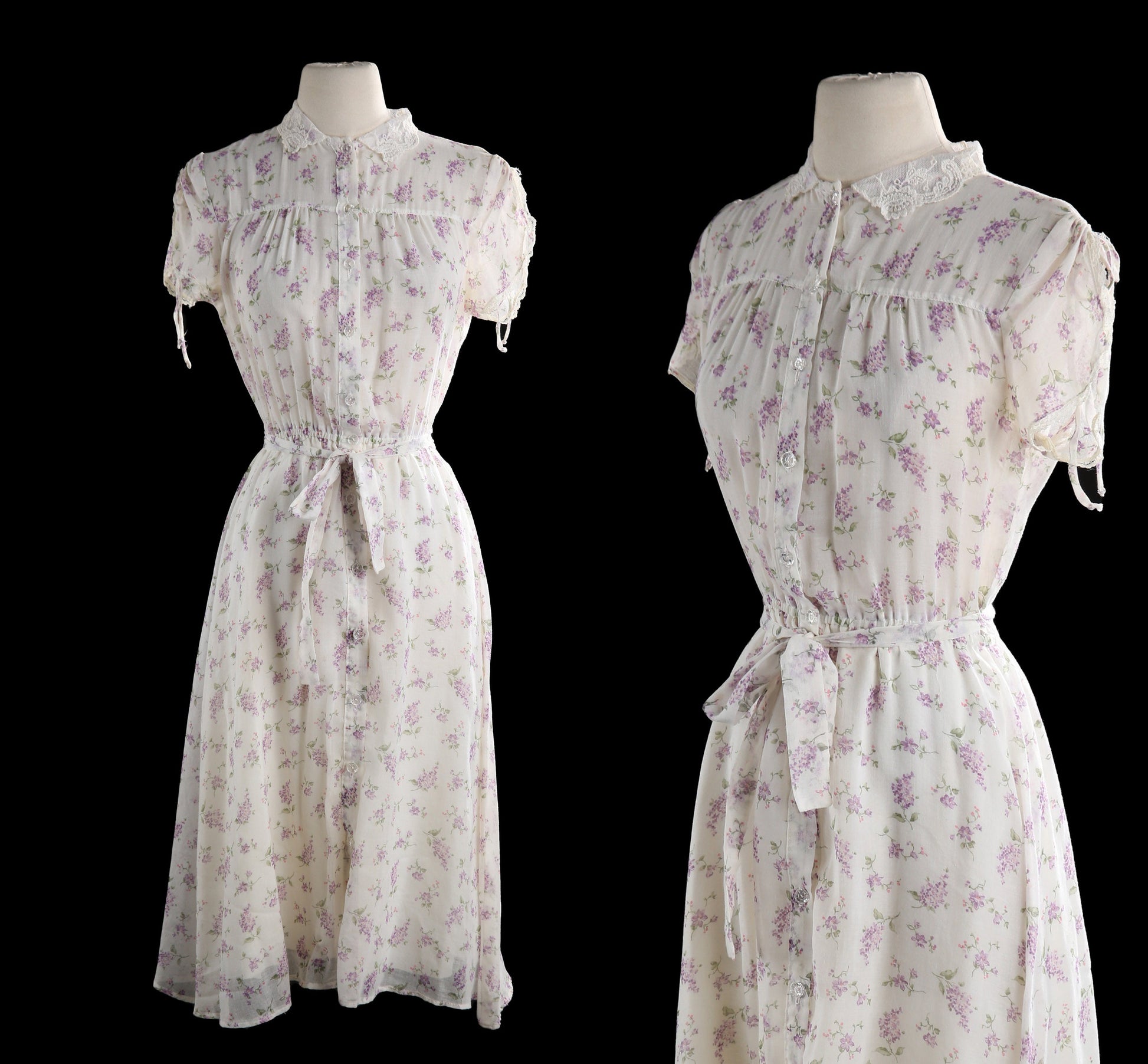 Vintage Floral Print White Summer Dress Sheer Maxi Waist Wrap Belt