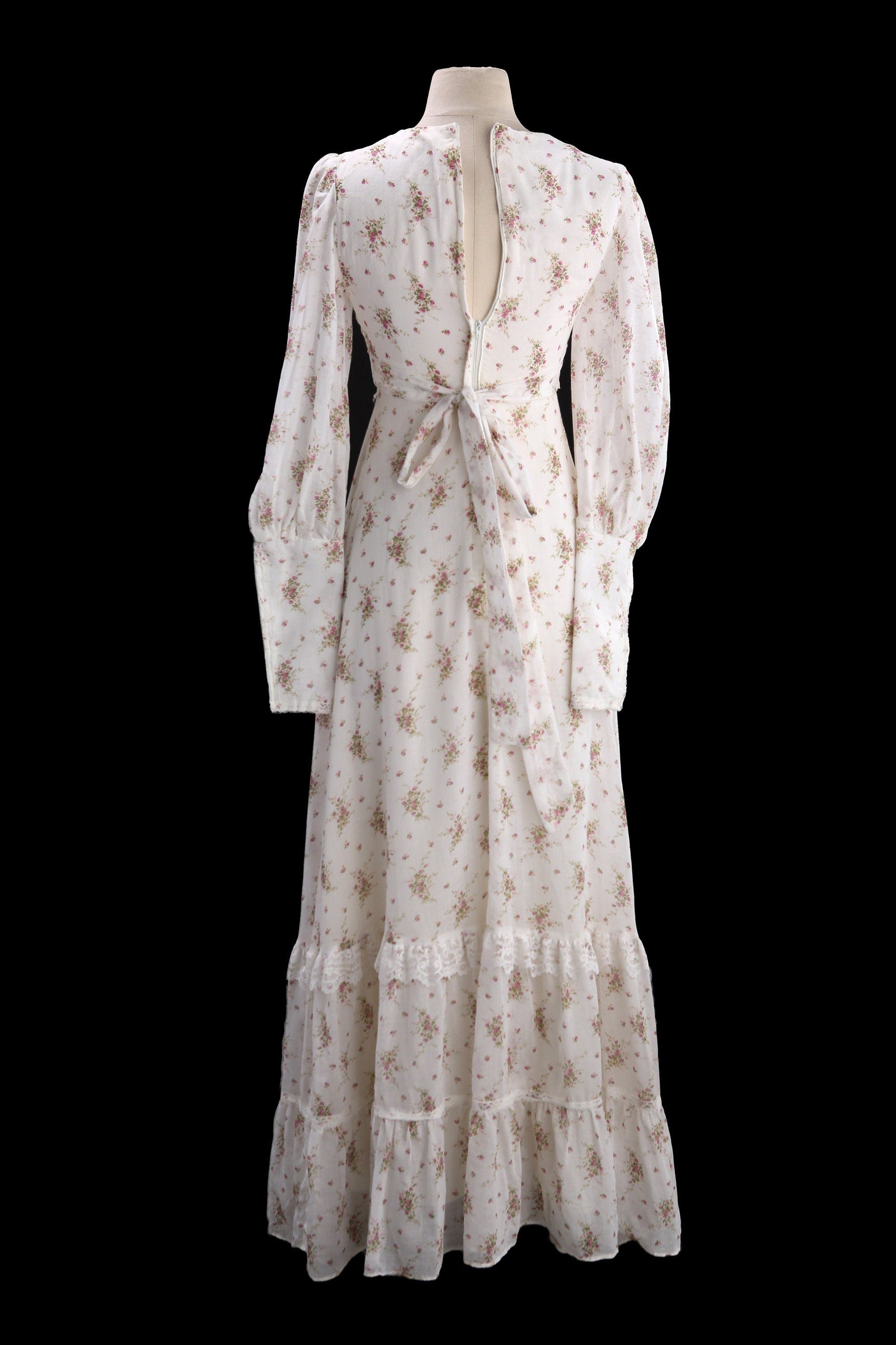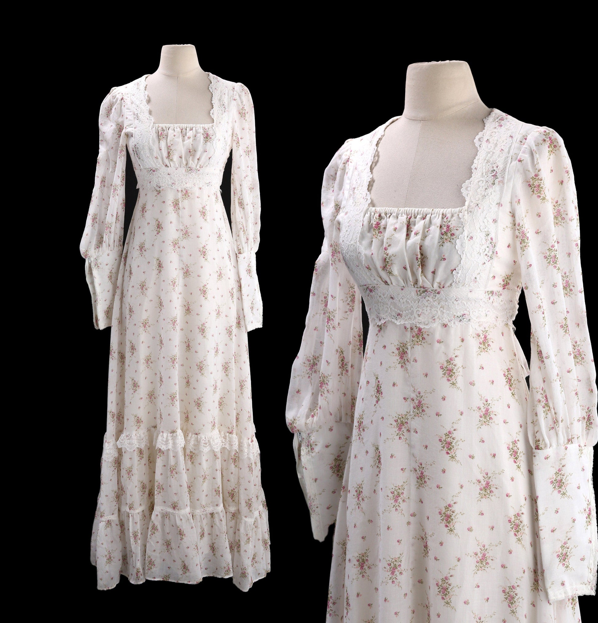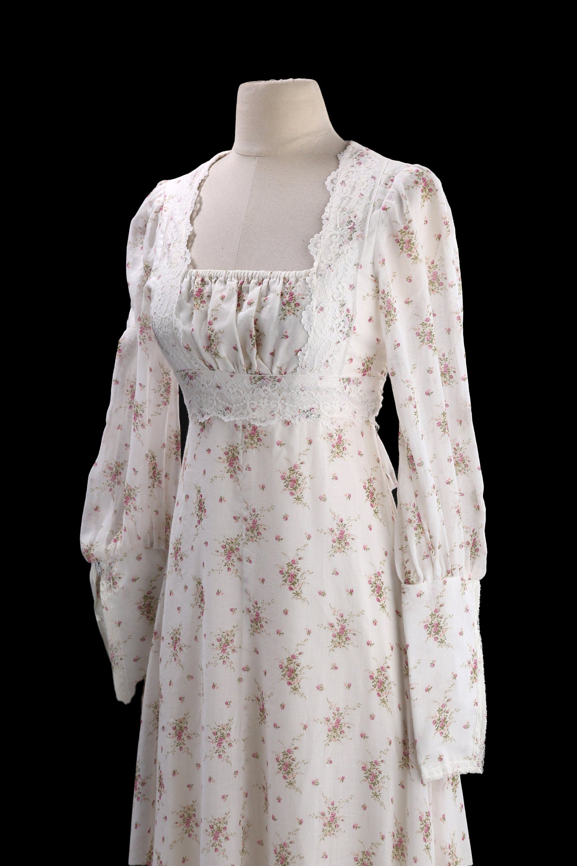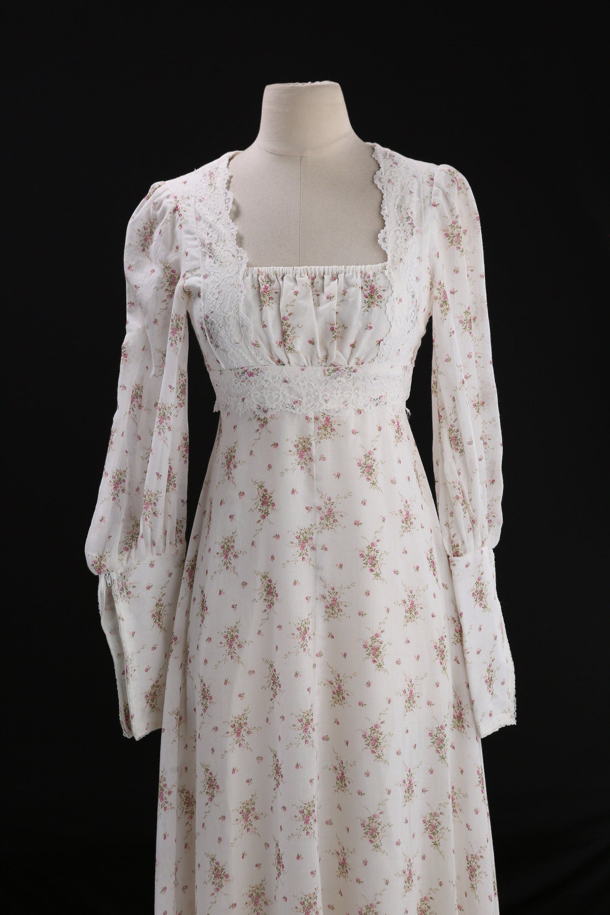 Vintage 1970s Prairie Dress / Floral Print / Long Sleeve / Cotton / Summer / Long / Waist Belt / Square Neck
