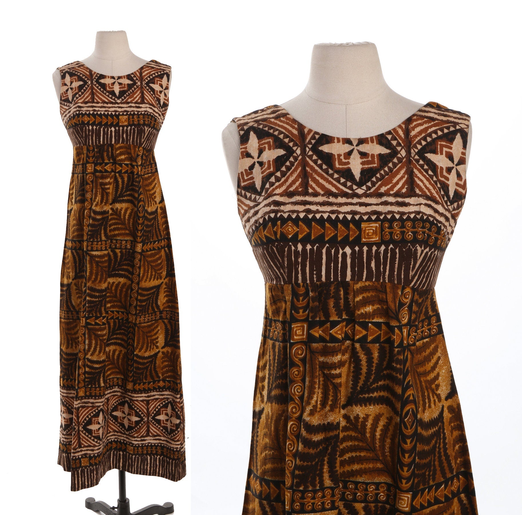 Vintage Hawaiian Dress - Brown Tribal Print - Era 70's - 80's