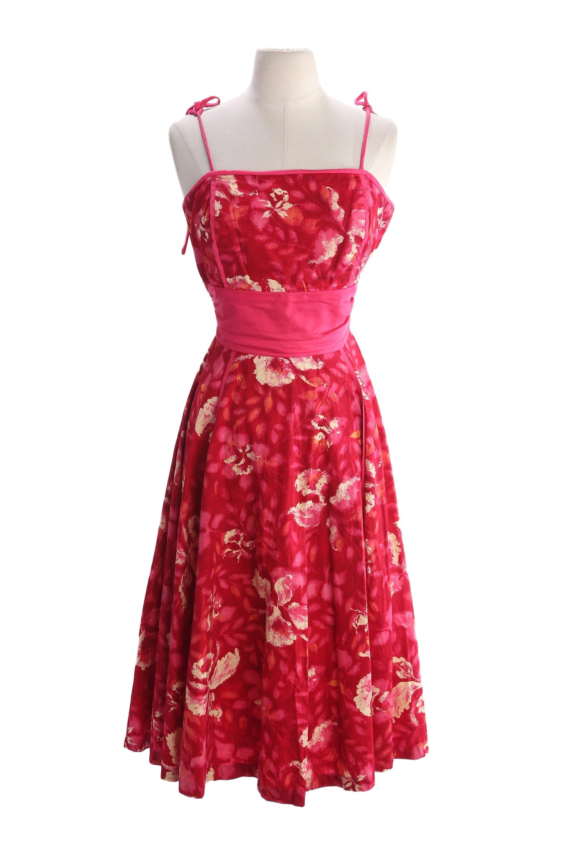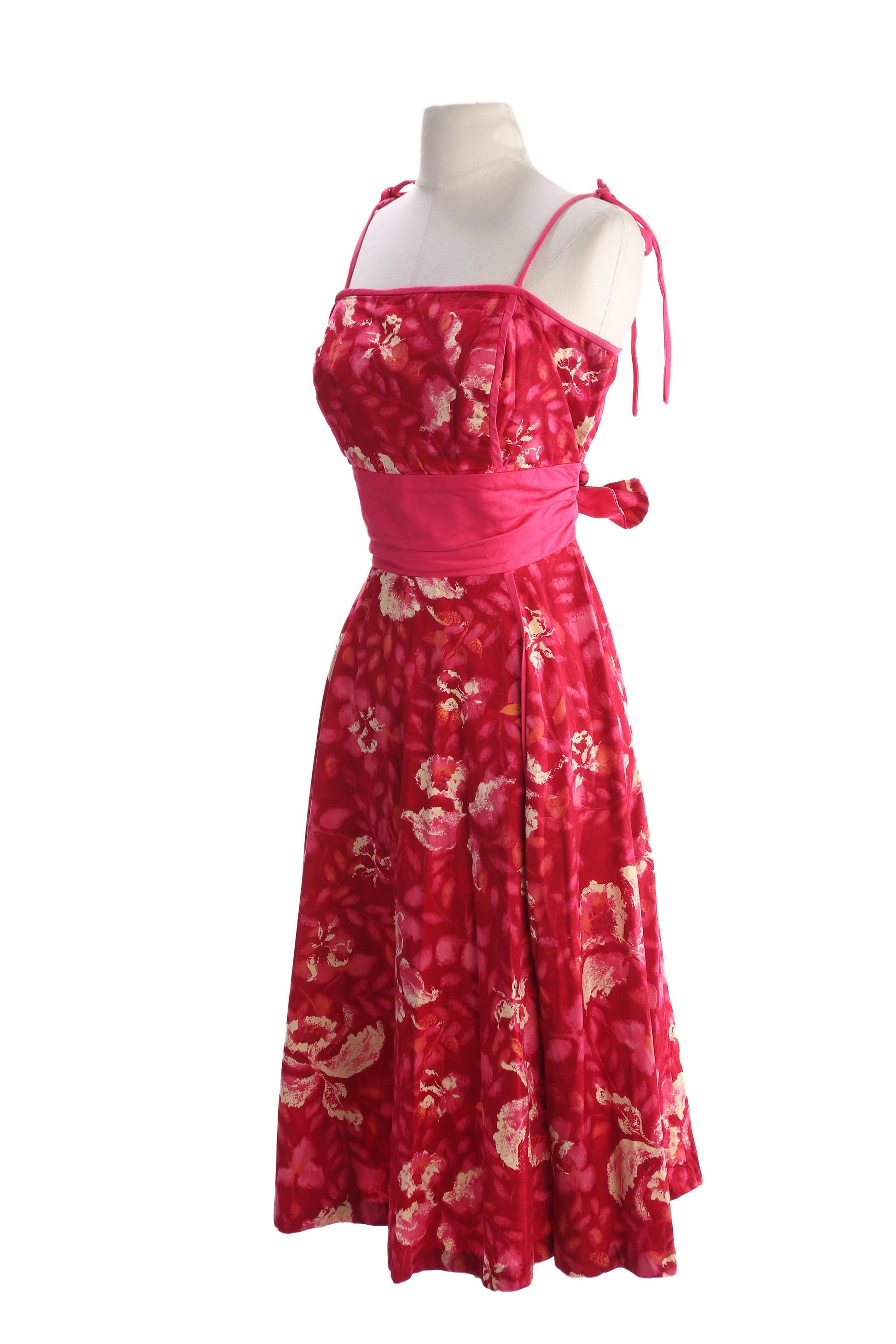 Vintage Hawaiian Dress - Red Floral Print - Estimated Era 1940's - 1950's