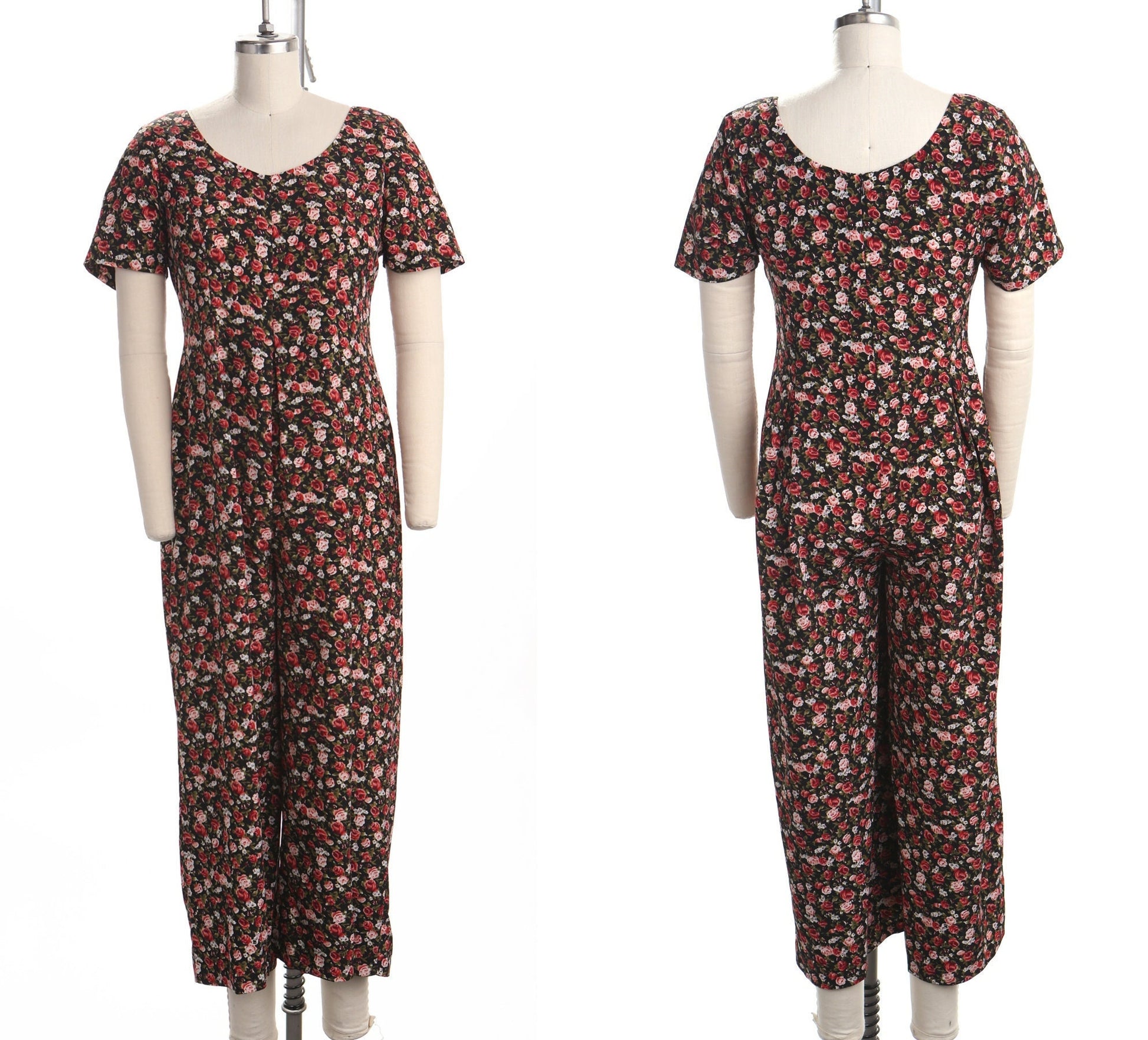 Vintage jumpsuit romper 90's floral red black summer casual rayon