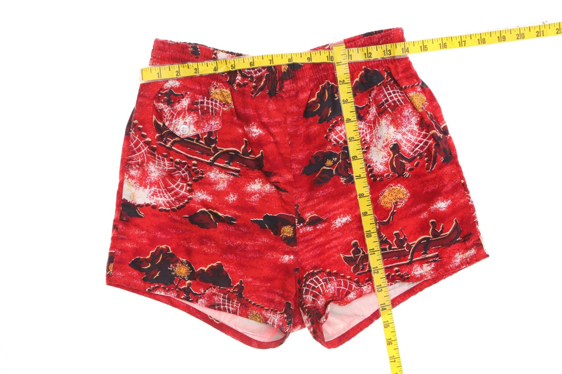 Vintage men 50's red swim trunks short surf surfing hawaiian print fishing