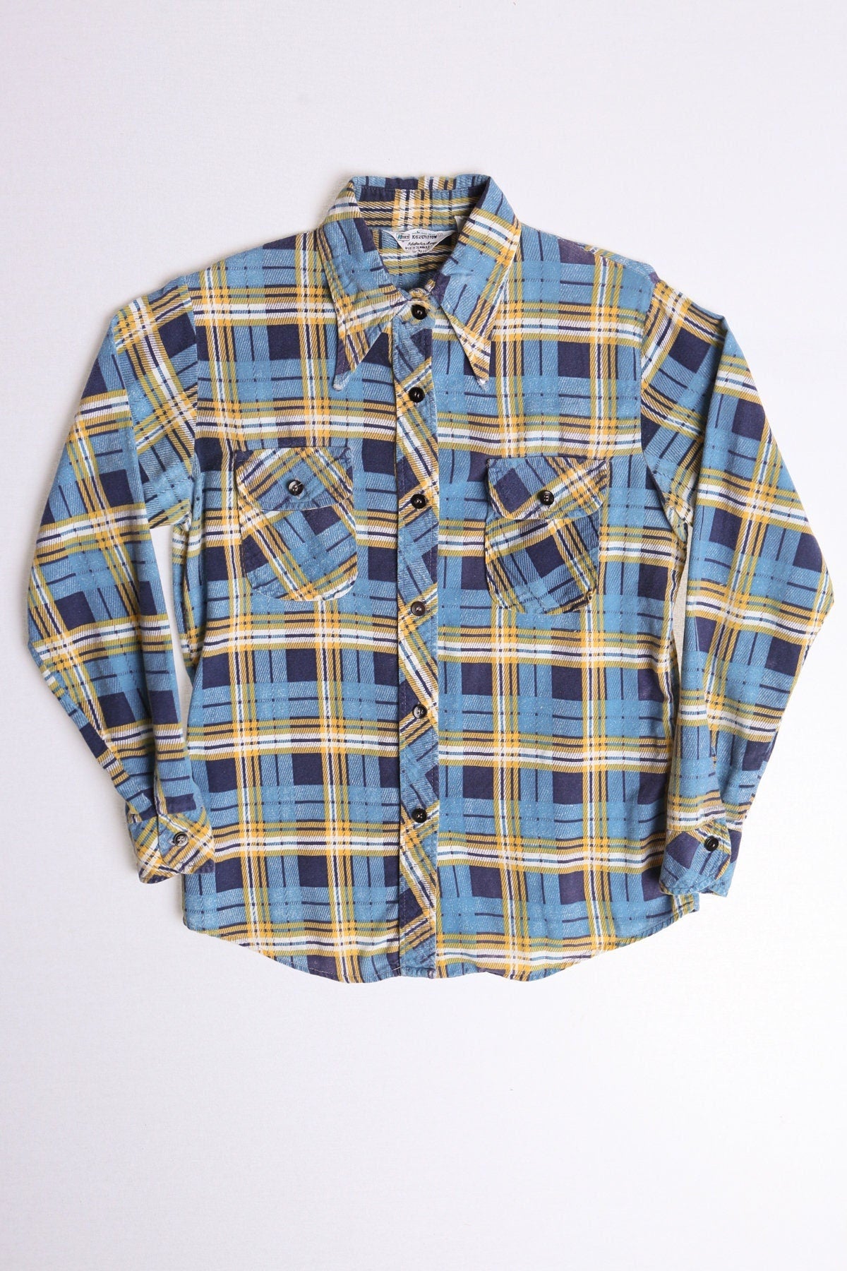 Vintage men 70's flannel shirt plaid blue yellow size 32 button up lumberjacket