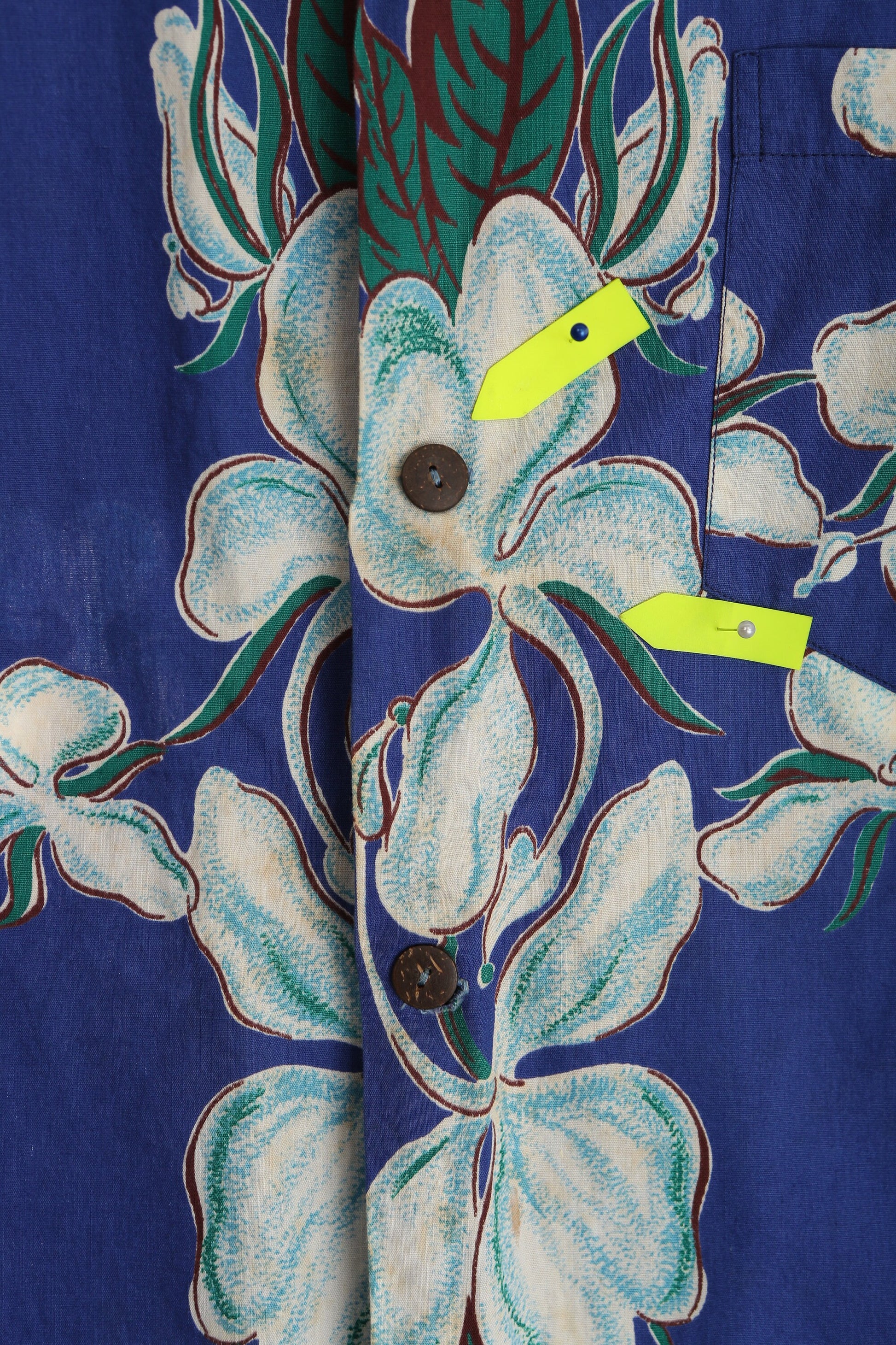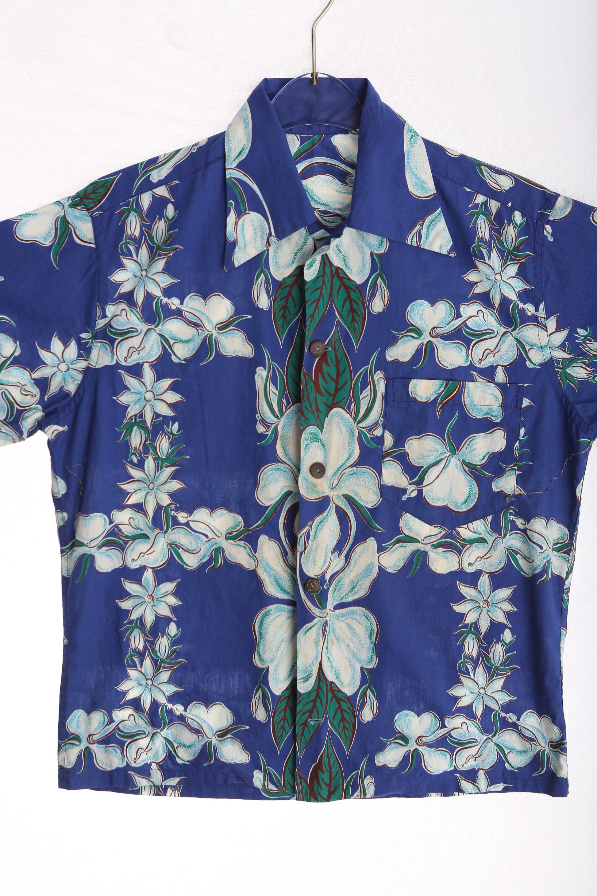 Vintage Men's Blue Hawaiian Shirt with Wooden Buttons / Estimated Era: 50s - 60s