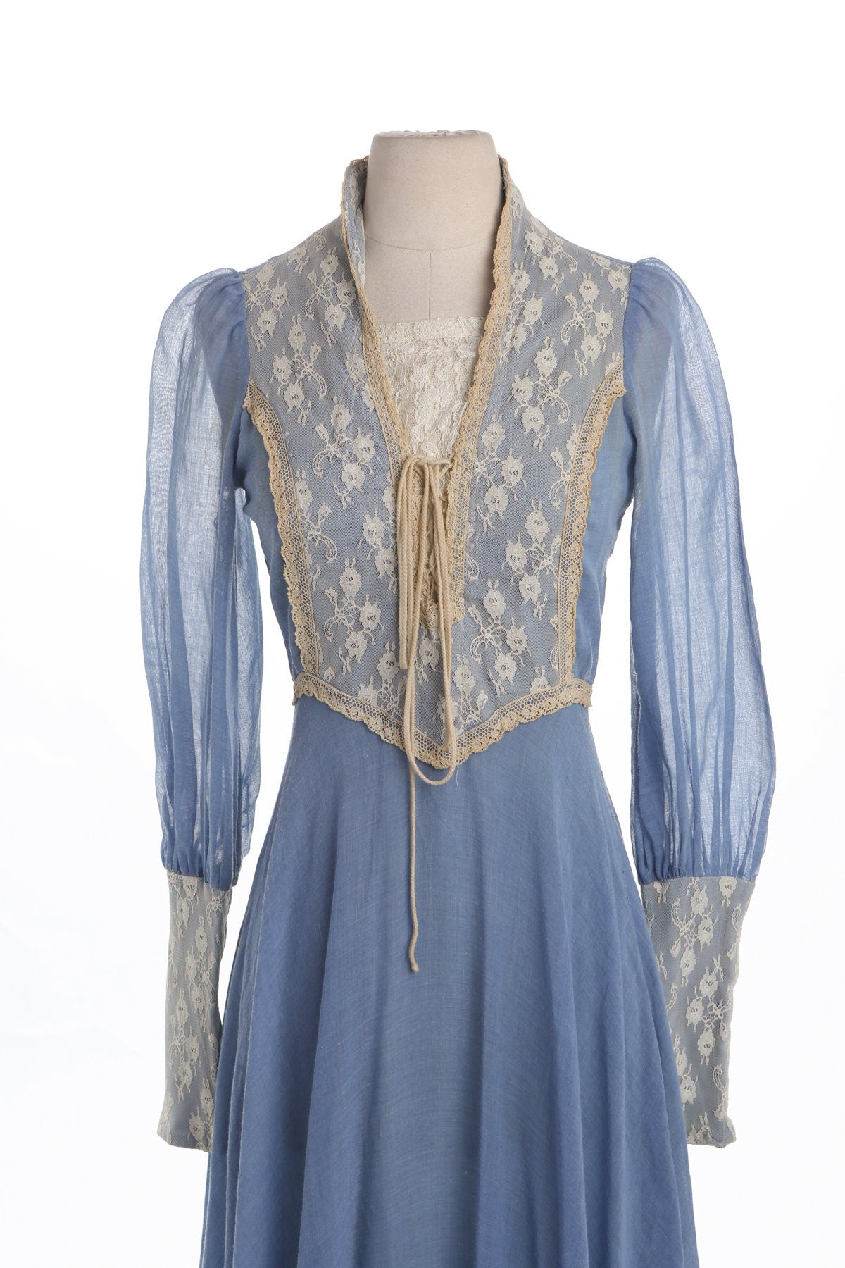 Vintage Prairie Long Floral Lace Blue Dress - Era 60's - 70's
