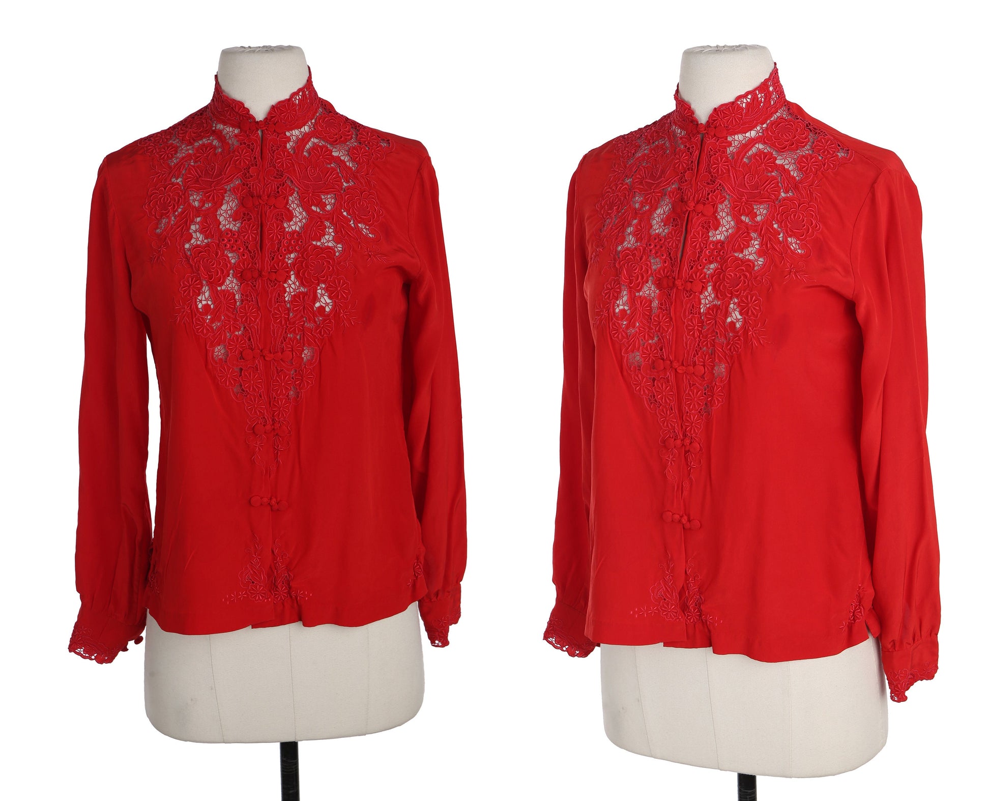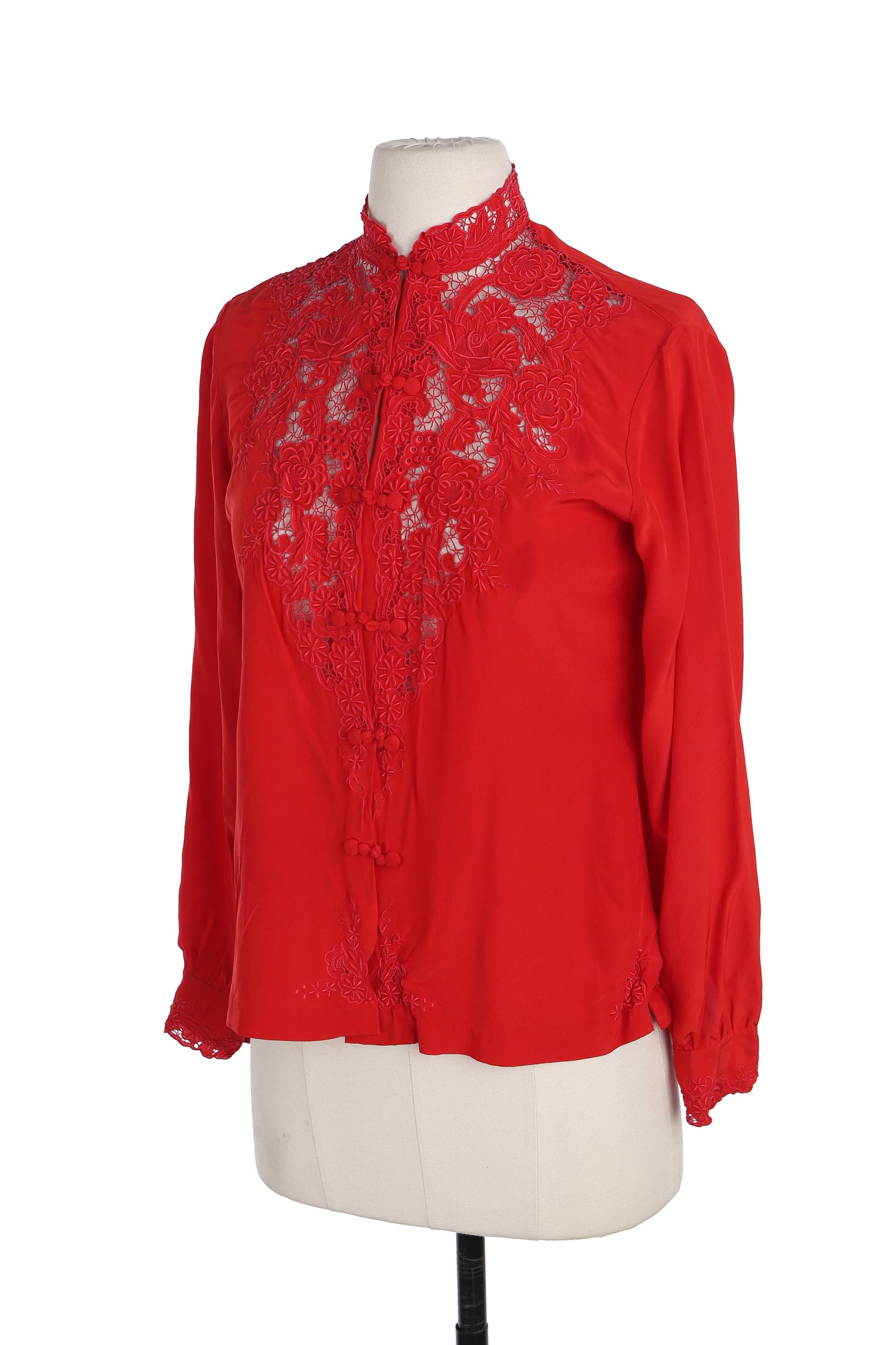 Vintage Red Cheongsam Silk Top with Floral Embroidered Details