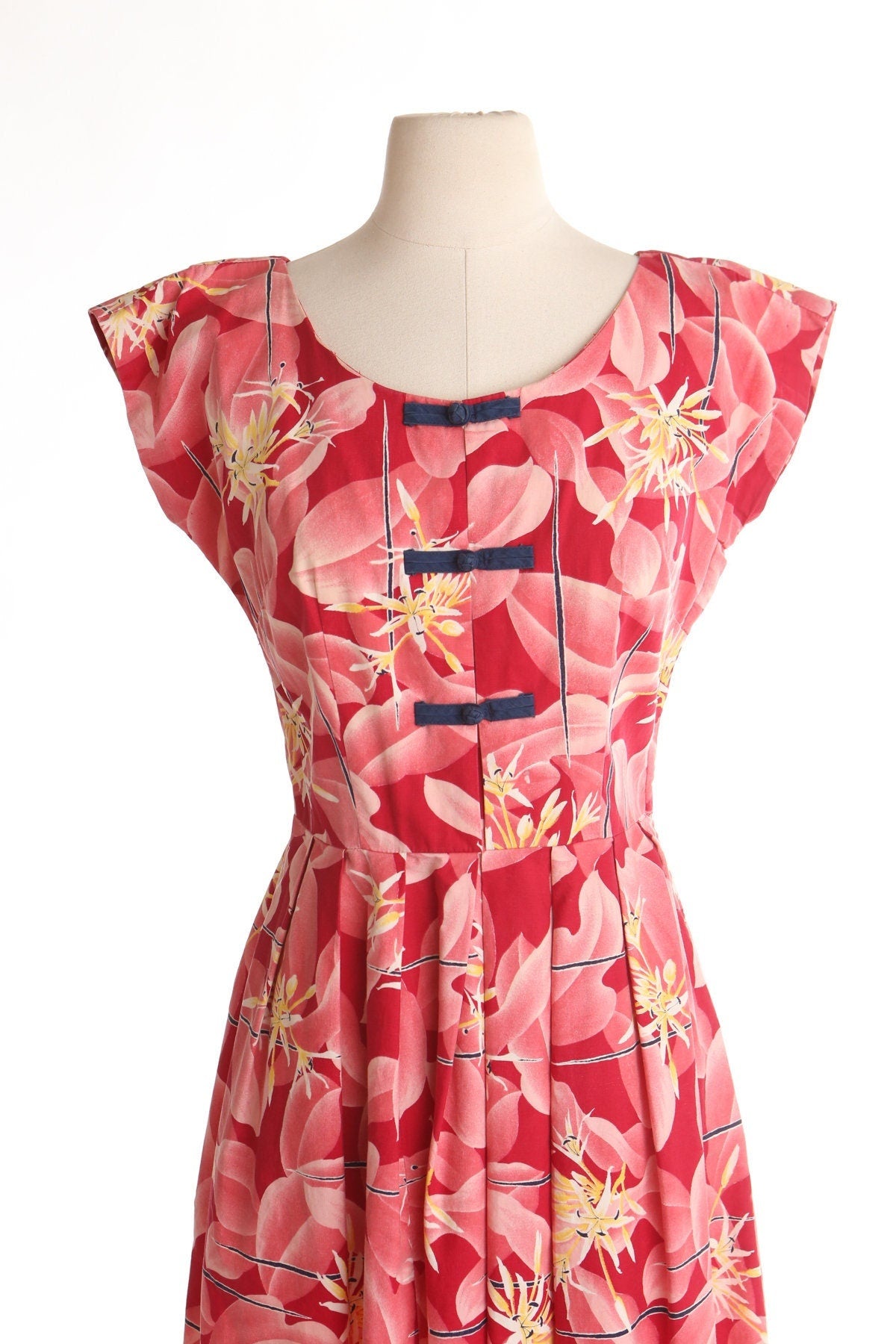 Vintage red hawaiian dress 40's 50's made in hawaii malihini label 12 pink up