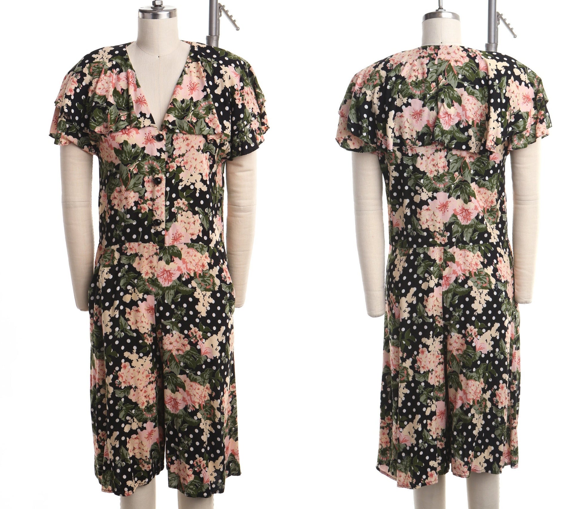 Vintage romper black pink flower summer rayon dress 90's casual y2k women