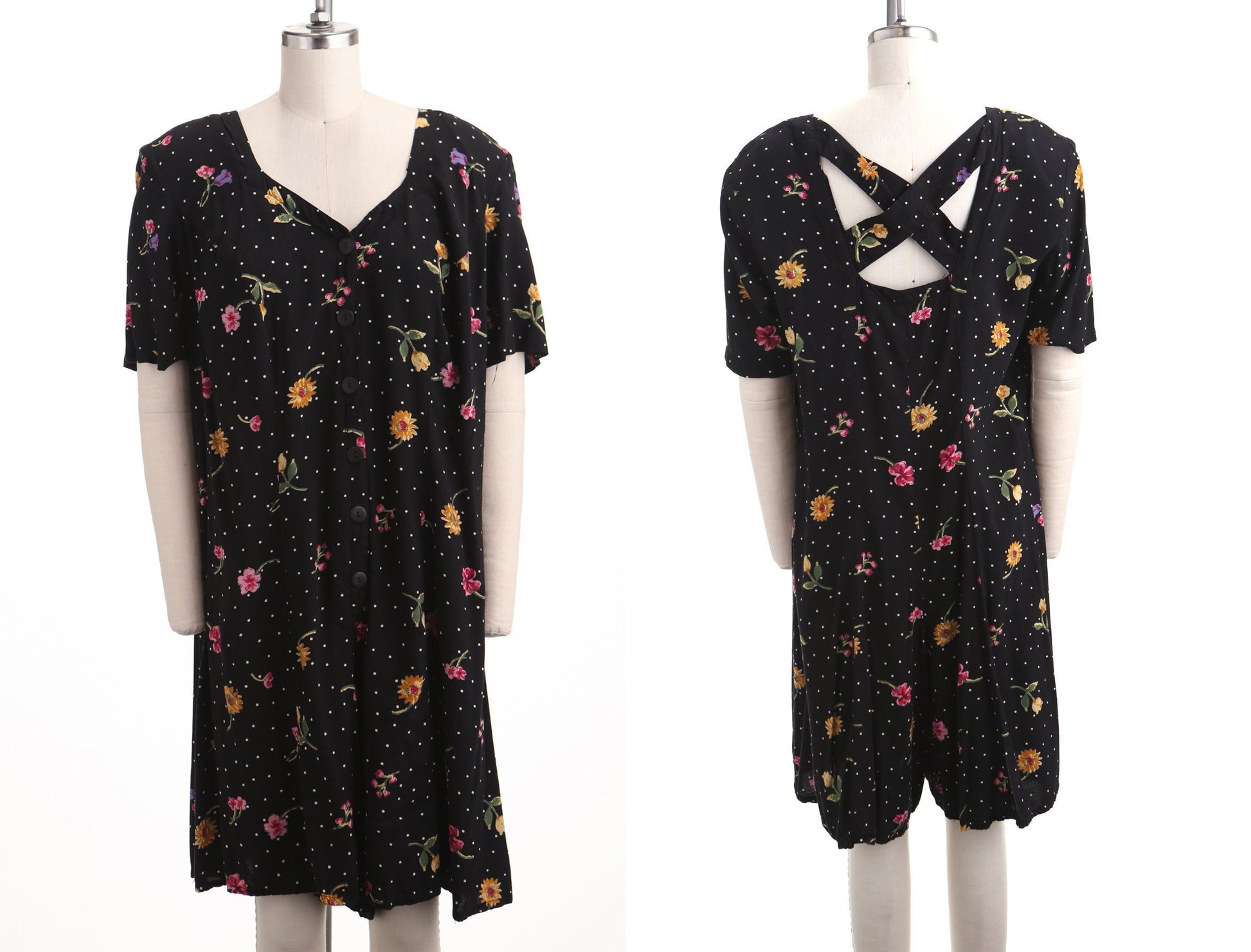 Vintage romper dress jumpsuit floral print 90's black button summer spring