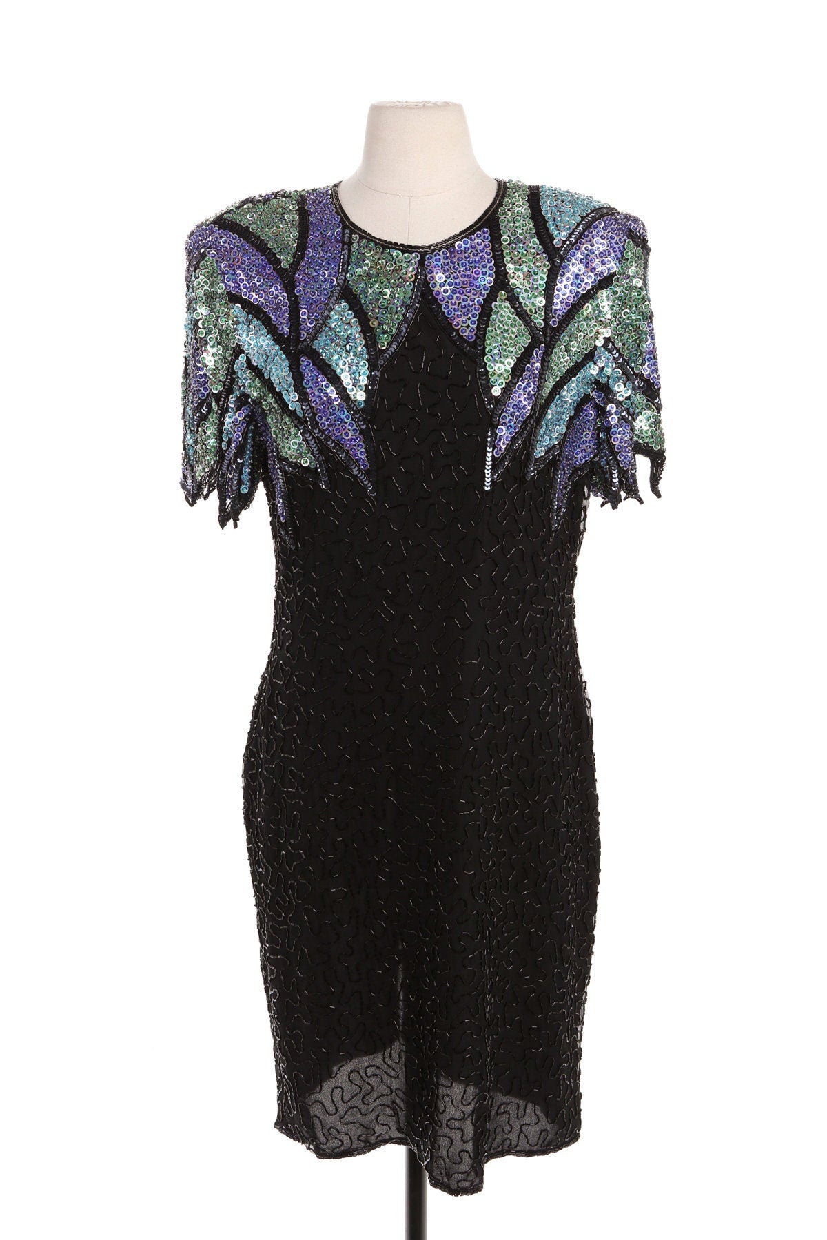 Vintage Sequin Dress - Short Sleeve - Shoulder Leaves Pattern - Era - 80's 90's
