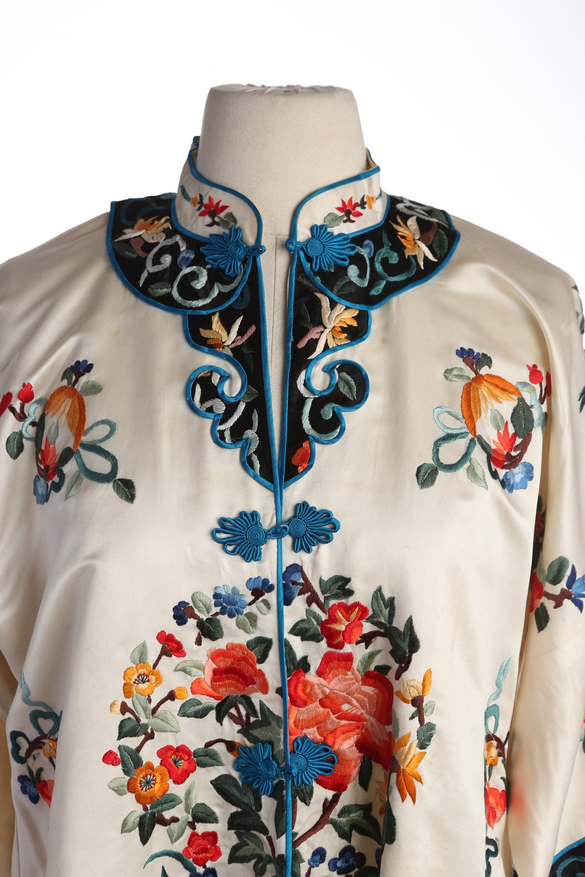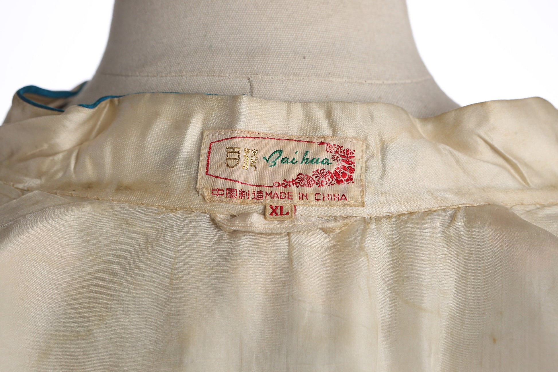Vintage White Cheongsam Embroidered Robe by Bai Hua - Made in China - Estimated Era 1980's - 1990's