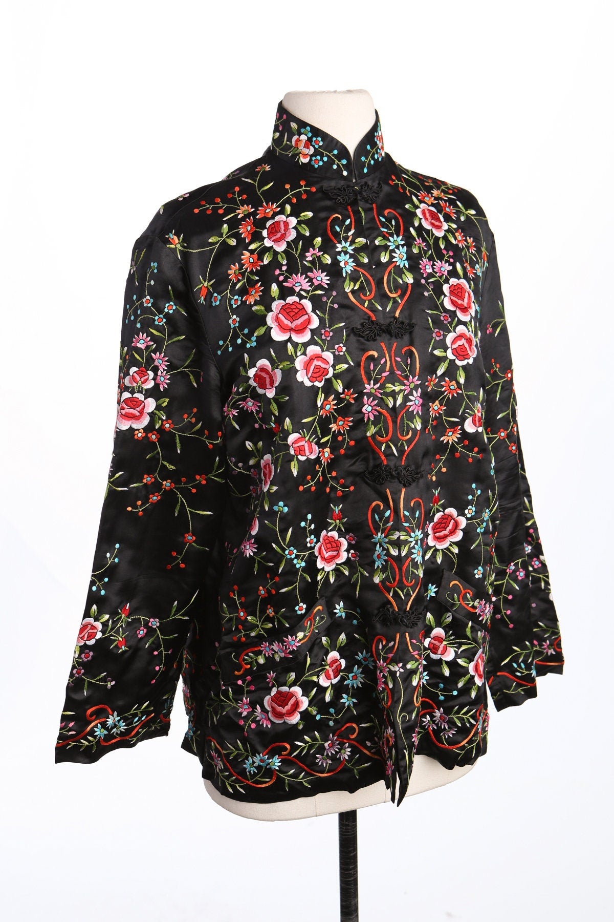 Vintage Women Black Chinese Floral Embroidered Jacket